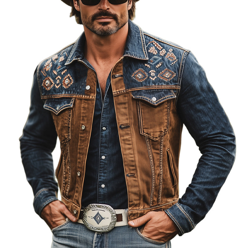 Men's Western Cowboy Style Vintage Color Block Embroidered Denim Jacket MTA1348E6U