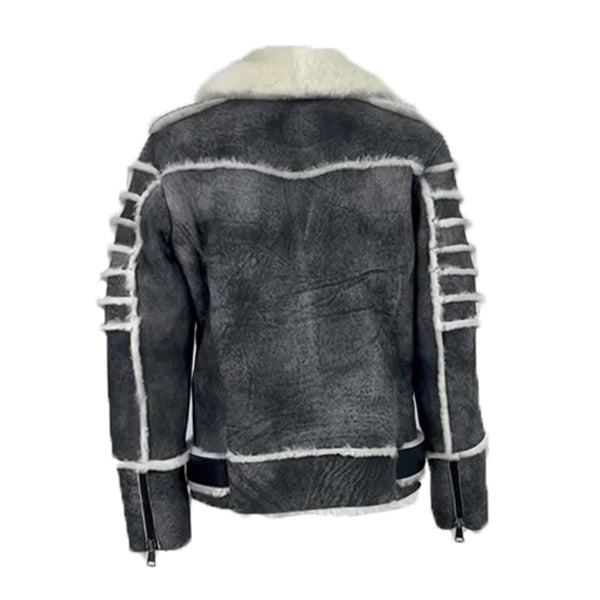 Get a luxurious yet simple biker jacket that can enhance your look so well while protecting you from the harsh winter breeze. Albert distressed Grey shearling biker style jacket can make you look exceptional without taking much effort. With a zipper closure for easy wear, collar and notch lapels, zip cuffs, 1 pocket inside and 2 functional pockets outside to make your hands warm with a coin pocket on top.