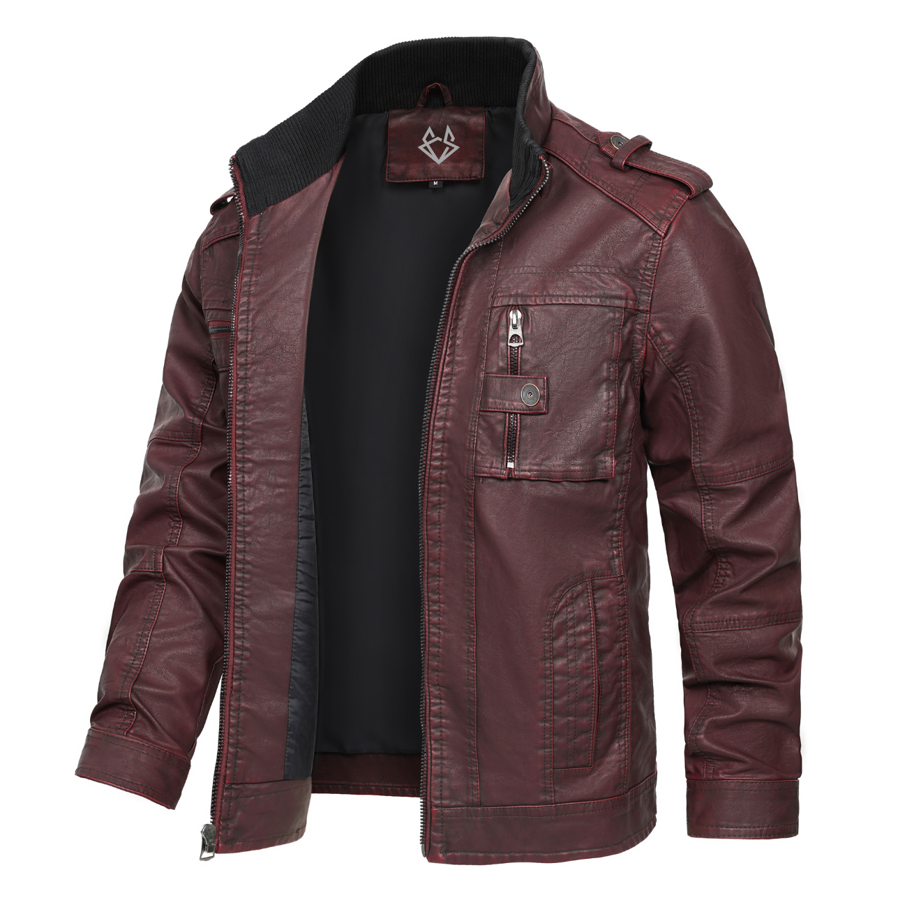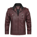 This jacket features a deep burgundy color that stands out in any crowd, perfect for those who want to add a touch of rebellion to their wardrobe. Crafted with high-quality faux leather, it offers durability and a smooth finish. Detailed with multiple pockets, metal accents, and a stylish ribbed collar, this jacket combines functionality with a rugged edge. The interior is designed for comfort, making it suitable for all-day wear. Whether you're riding through the city or meeting friends, this leather jacket ensures you do it in style.