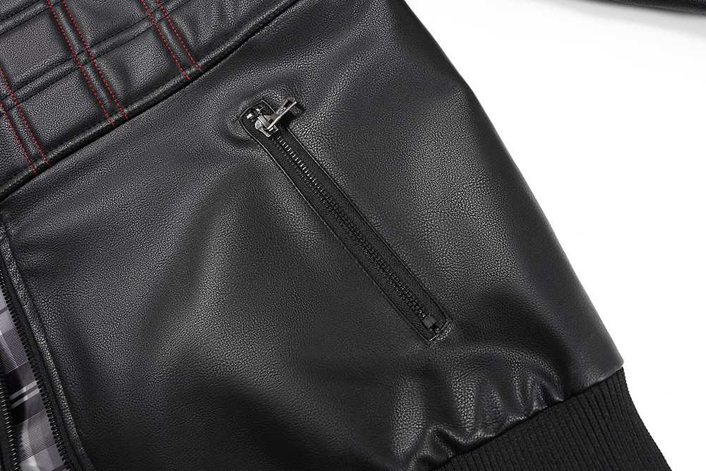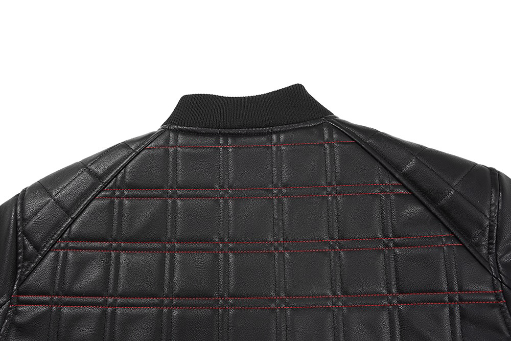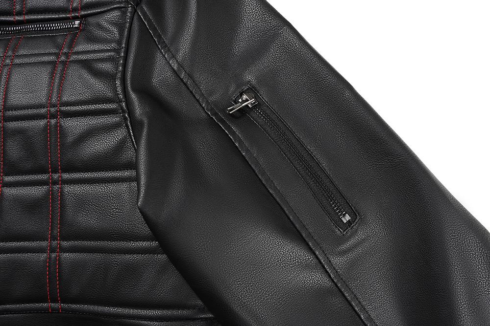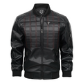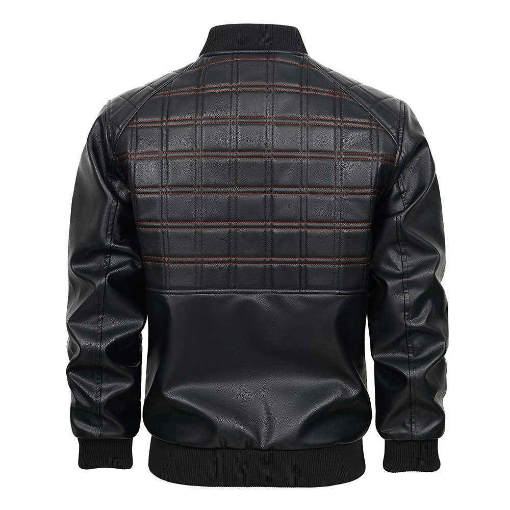 Crafted from premium faux leather, this jacket boasts a luxurious texture and a sleek black finish. The standout feature is the quilted detailing, accentuated by red stitching that adds a dynamic contrast to its overall look. Equipped with multiple zippered pockets, this jacket combines functionality with fashion. The ribbed collar, cuffs, and hem ensure a comfortable, snug fit that seals in warmth, making it ideal for cooler days. Perfect for the fashion-forward man, this jacket is a versatile piece that complements both casual and dressy outfits, ensuring you stand out in any crowd. Whether you're riding a motorcycle or heading out for a night on the town, the Damon jacket is your ticket to a confident, polished appearance.