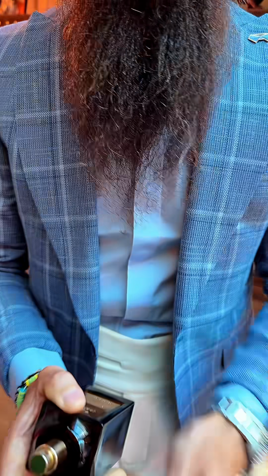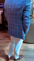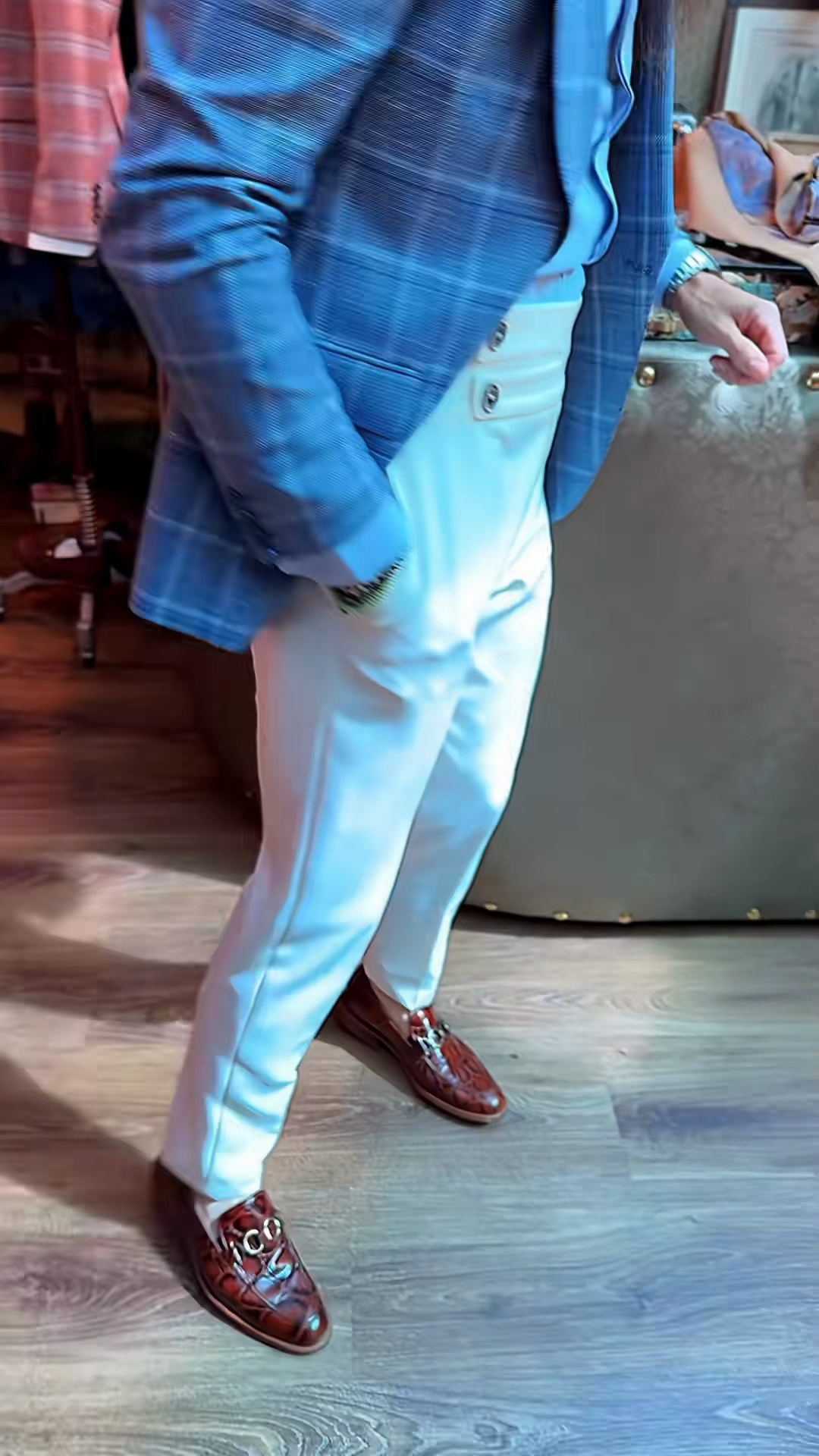 This blue checkered blazer is crafted from a textured tweed fabric, featuring a classic plaid pattern. It has a tailored fit, complementing the high - waisted beige trousers and brown embossed loafers. Ideal for semi - formal or smart - casual looks, blending traditional tailoring with a modern aesthetic.