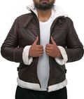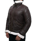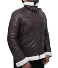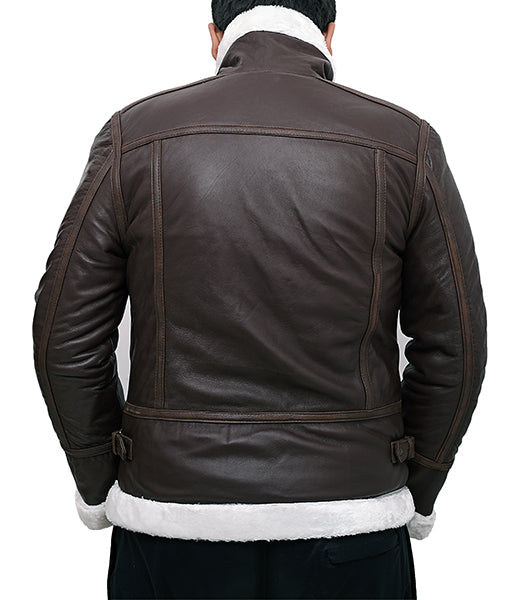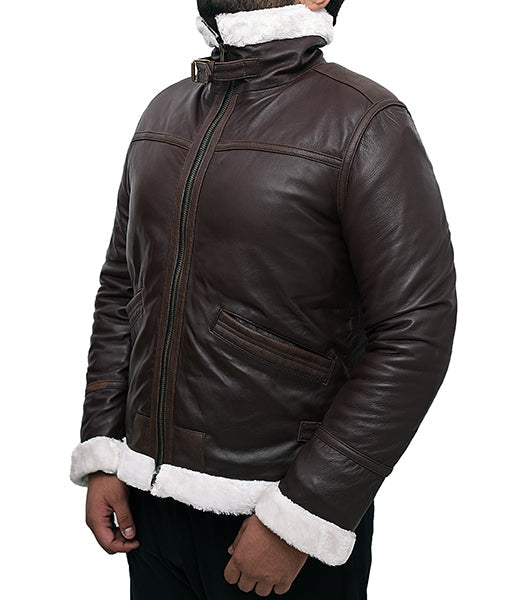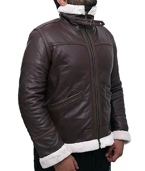 Inspired by the fearless spirit of aviators, this leather bomber jacket embodies pride and prestige; it makes every outfit feel bold and charismatic. Its rich brown leather exudes sophistication, while the faux shearling collar adds a touch of luxury and warmth.