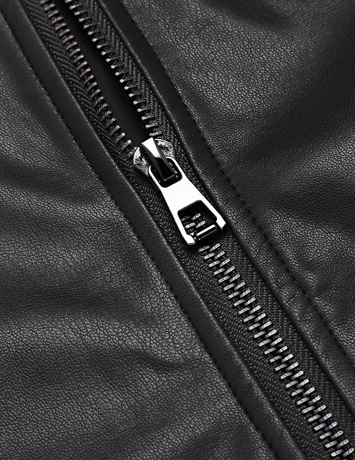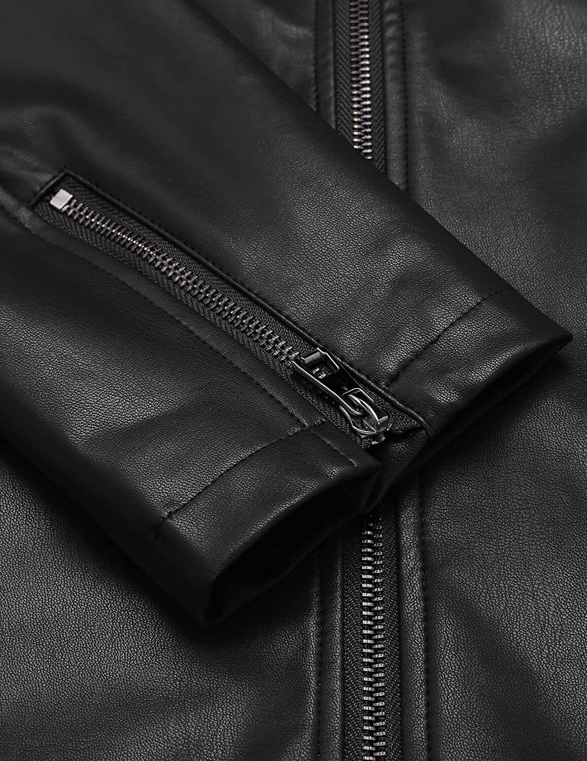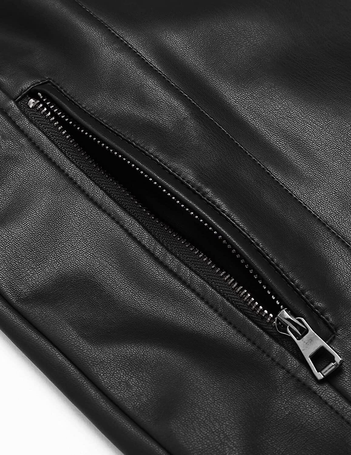 - FASHION DESIGN Men's faux leather jacket is featured with classic stand collar, slim fit, front zipper closure and adjustable zipper cuffs, two side zipper pockets, one zipper chest pocket and one interior welt pocket. Multiple pockets provide enough room for your wallet, phone and other belongings.