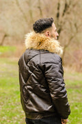 Brown V-Bomber style Puffer Winter Leather Jacket with fur collar