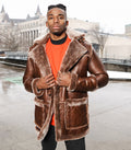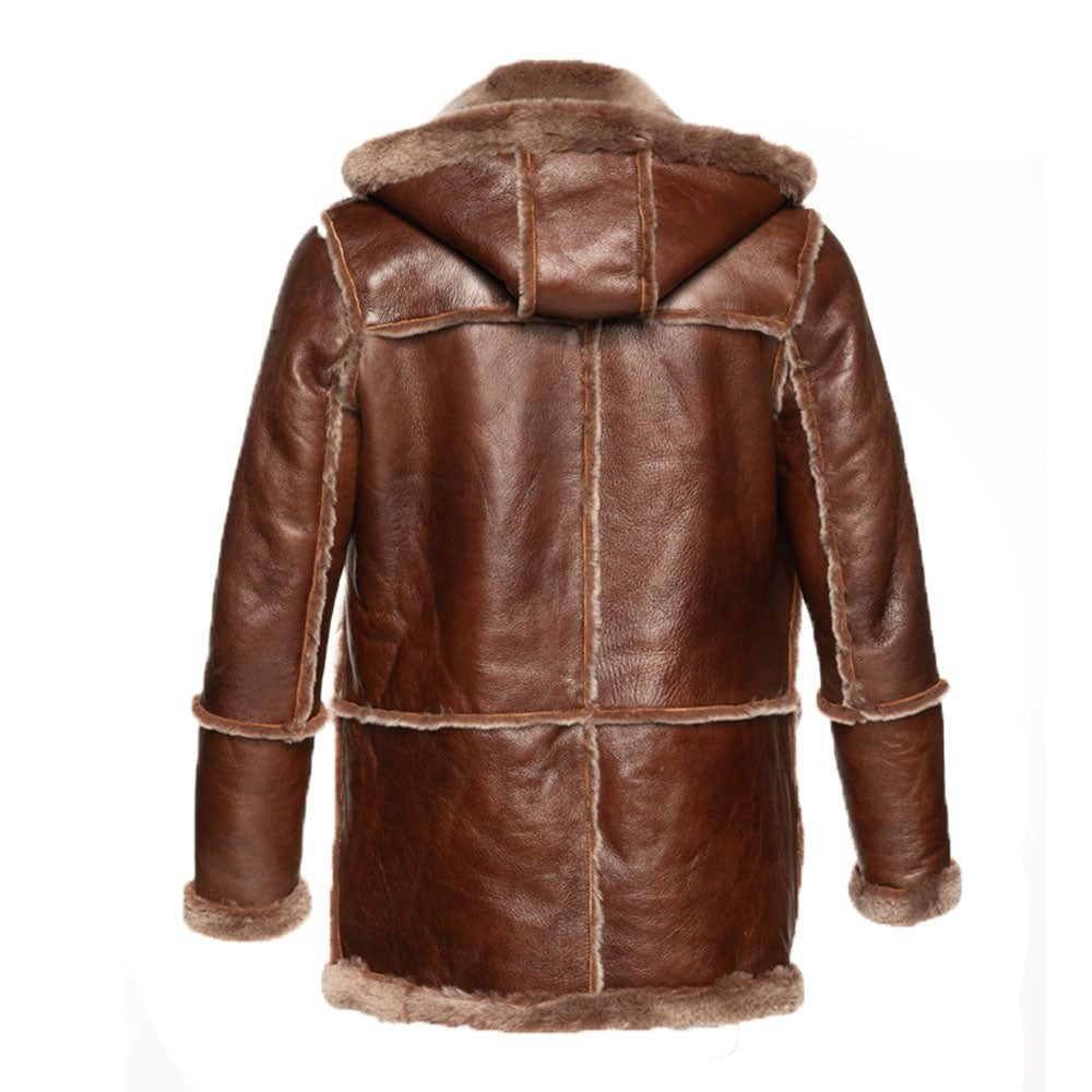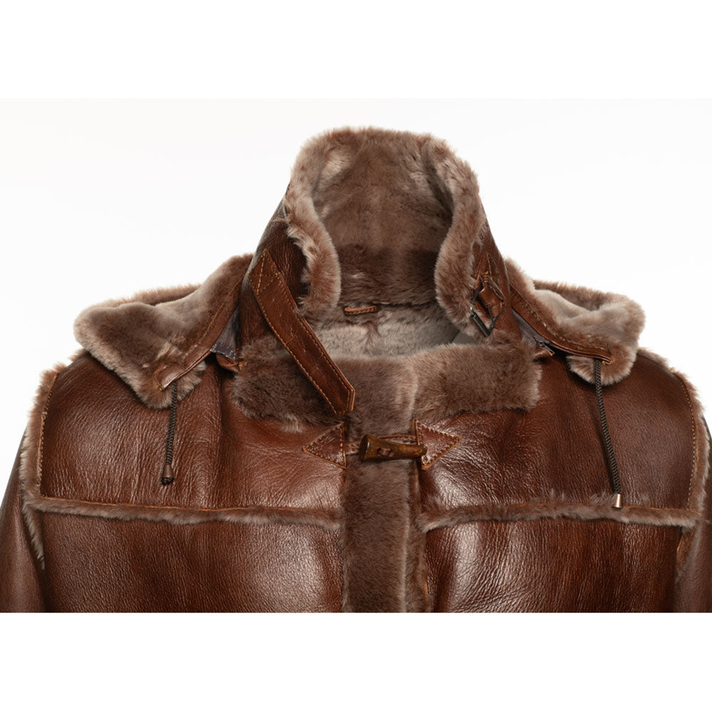 Eamon Brown duffle shearling jacket is rich with comfort and sophistication. The impressive Eamon Brown duffle shearling jacket is crafted from 100% fine Spanish merino double-faced sheepskin shearling and lined with a 100% sheepskin shearling interior for extra warmth. The collar is shirt-style with a hood and has a toggle closure at the front. The sleeves are secured with open-hem fur cuffs.