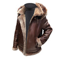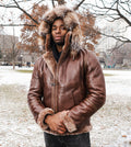 The standout feature of this bomber jacket is its detachable hoodie, offering adaptability for various occasions. Our Felix Brown Bomber jacket has a fur-lined collar and a detachable shearling hood for extra insulation. This stylish, limited-edition color jacket with fur-lined, open cuffs to keep you warm.
