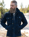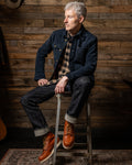 It features three reinforced patch pockets—two angled hand-warmer pockets and a left chest pocket—plus an additional buttoned flap pocket on the right chest. Each is strategically placed for accessibility and finished with rivets for extra durability. The jacket fastens with custom Master Supply Co. solid zinc donut buttons in antique finish, designed with a two-prong anchor for long-term reliability.