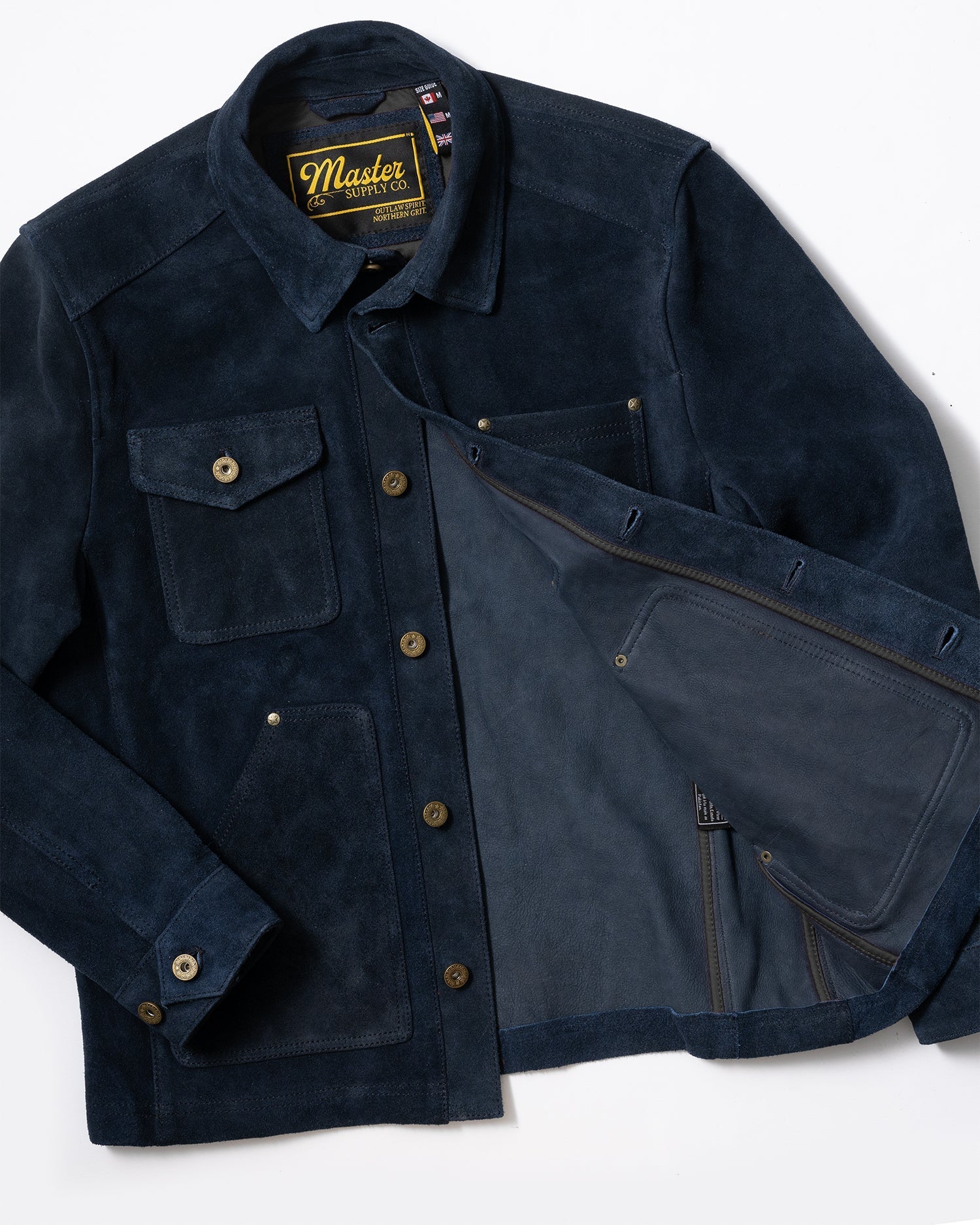 A rugged reinterpretation of the classic chore coat, built for durability, utility, and all-season wear. Cut from full-grain roughout cowhide in a deep navy blue, this unlined Field Jacket is designed to break in beautifully and age with character.