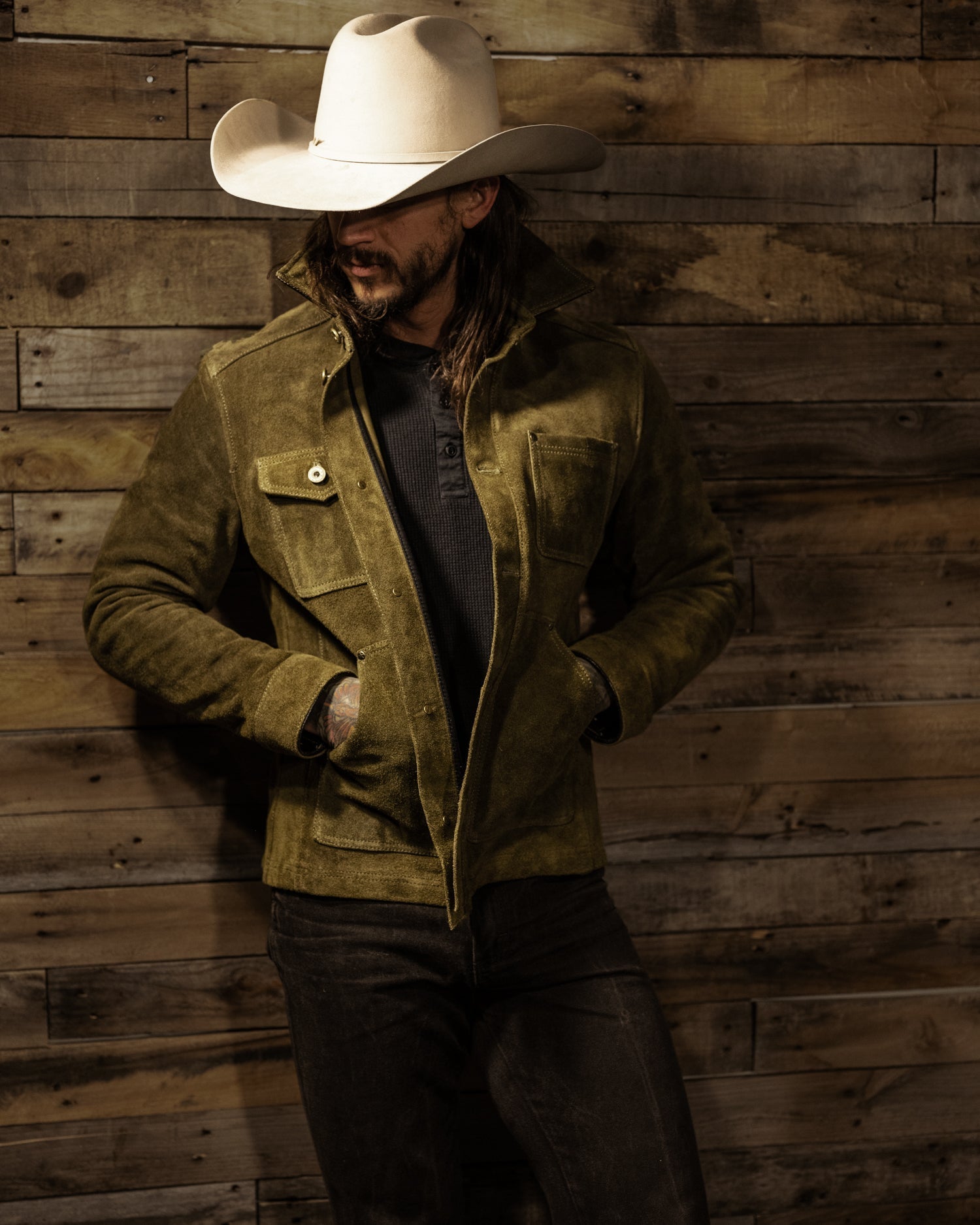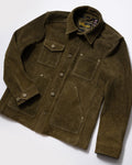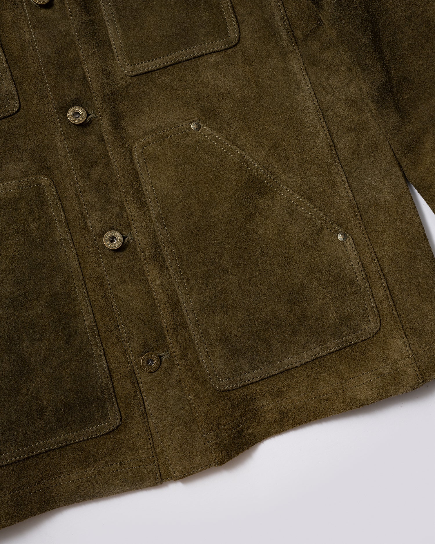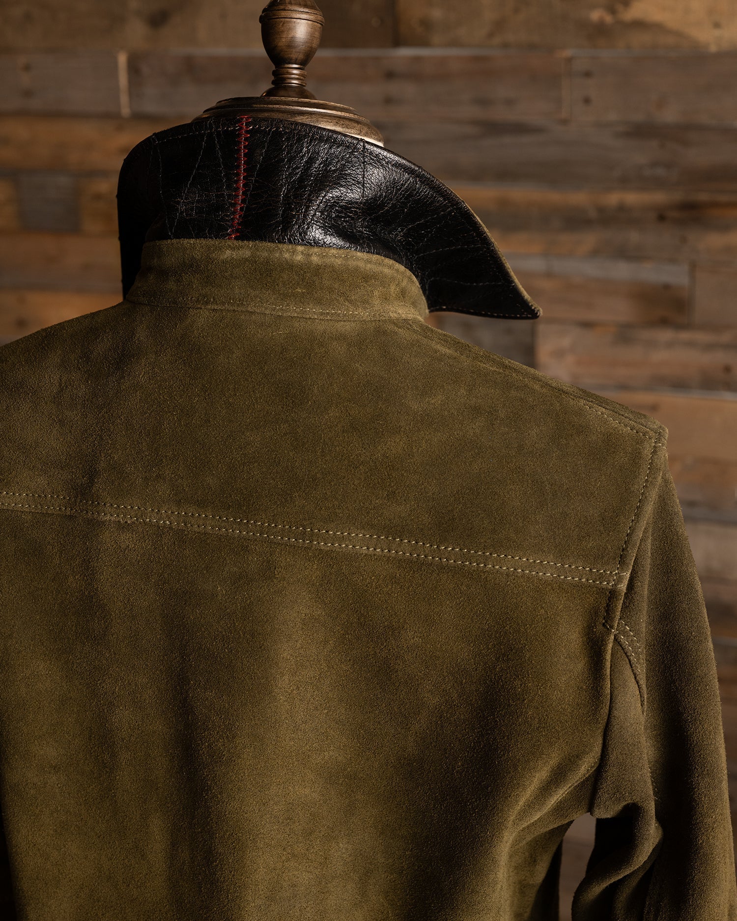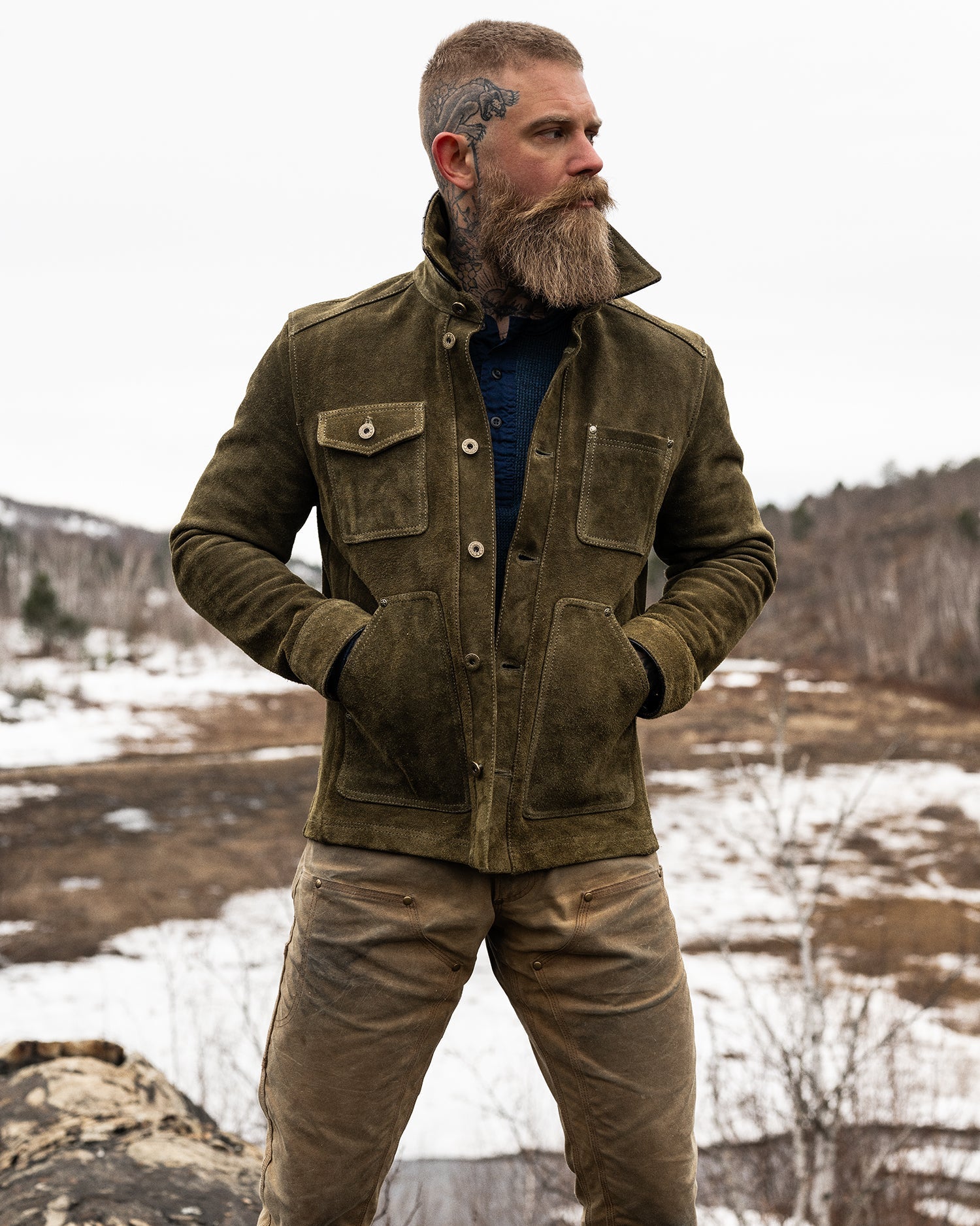 A rugged reinterpretation of the classic chore coat, built for durability, utility, and all-season wear. Cut from full-grain roughout cowhide in a deep tobacco-olive, this unlined Field Jacket is designed to break in beautifully and age with character.
