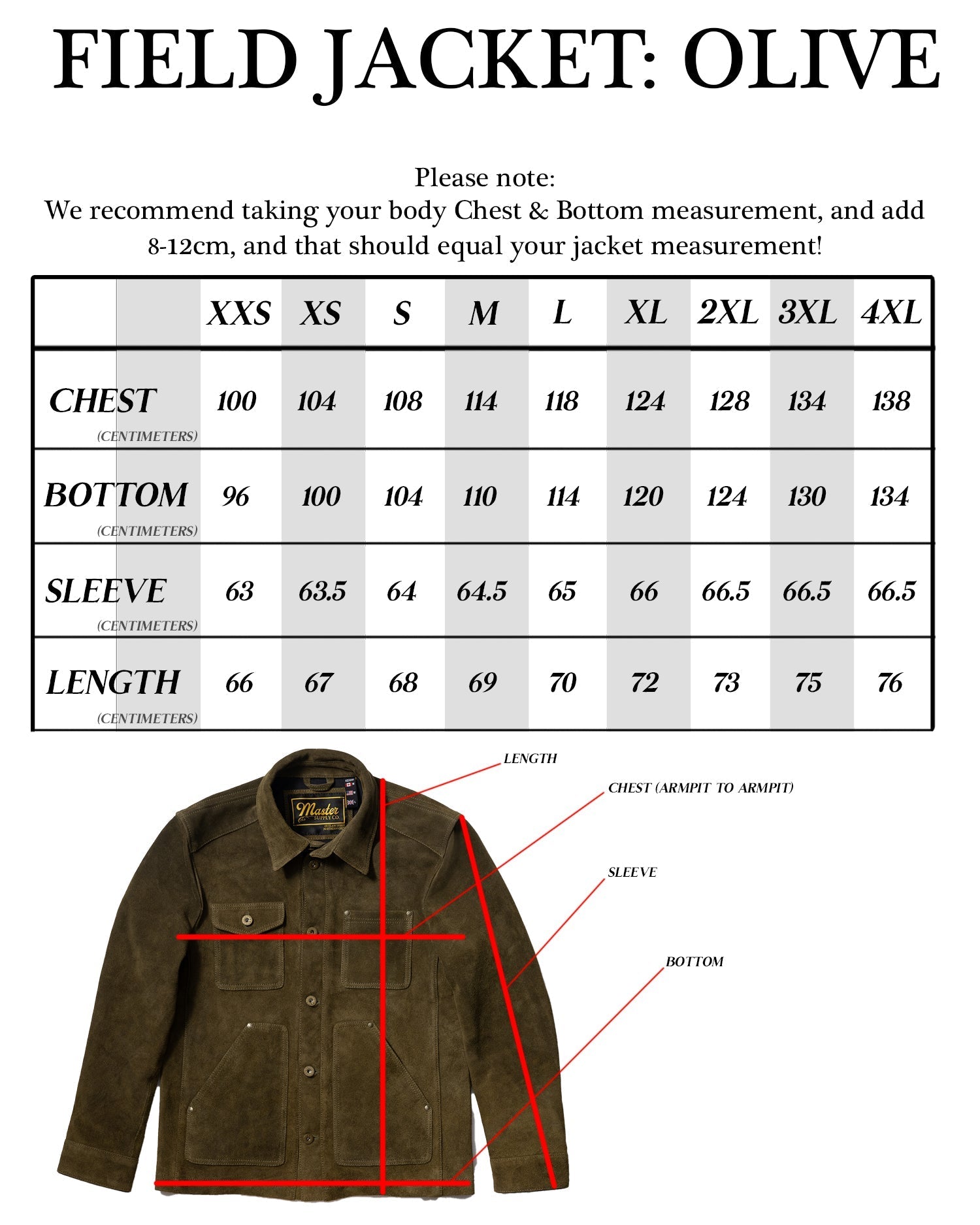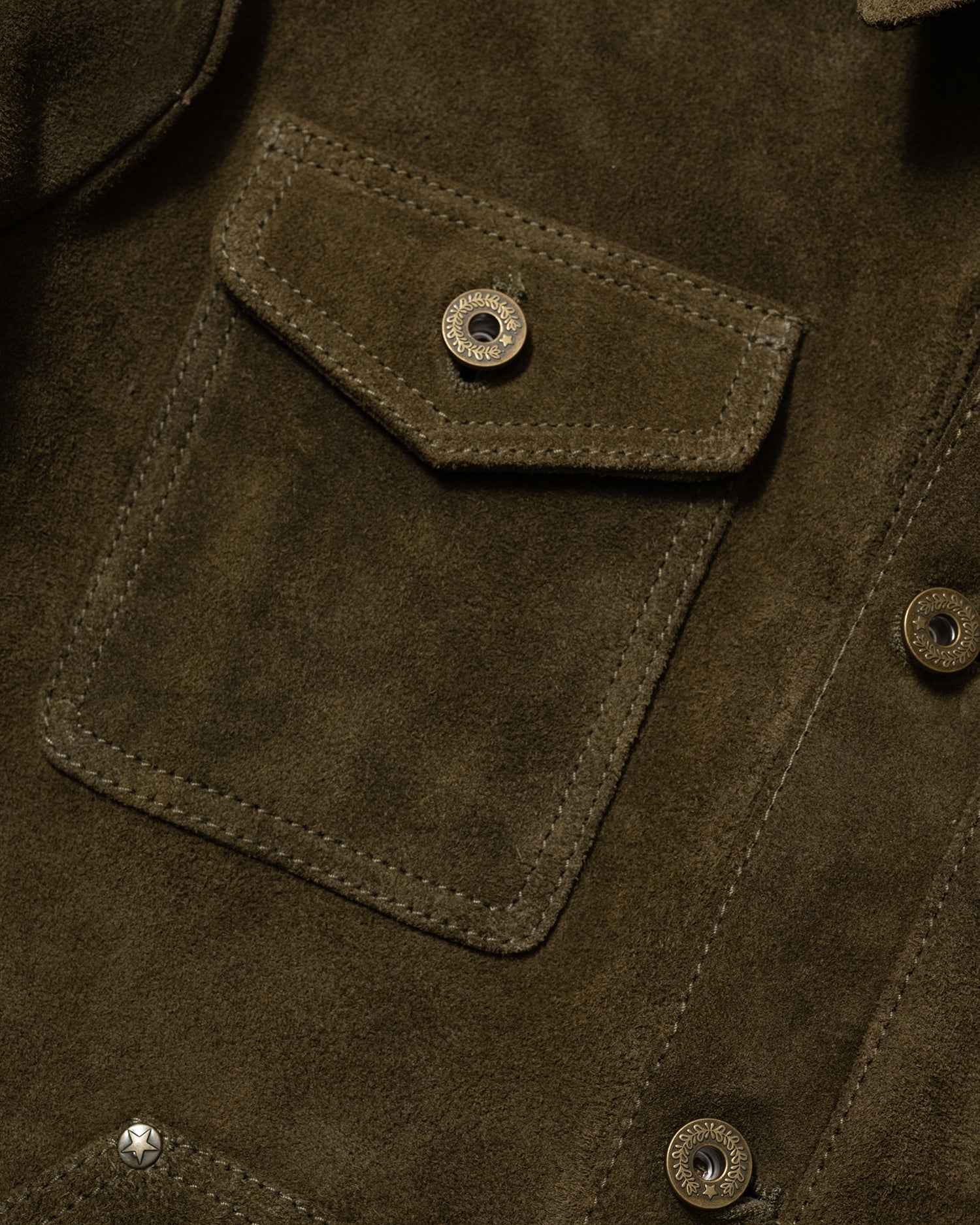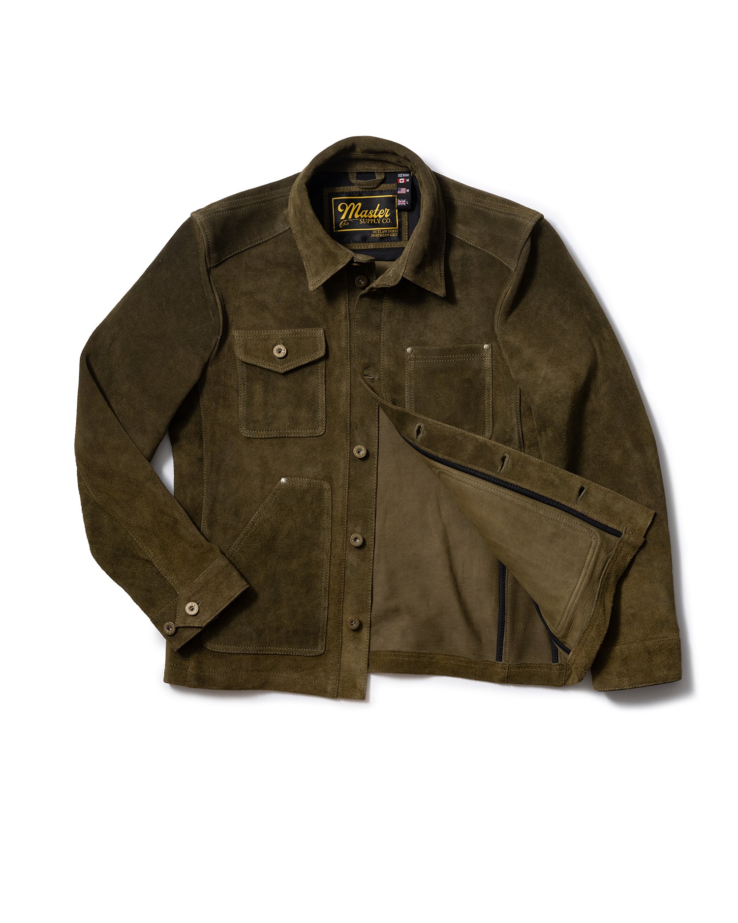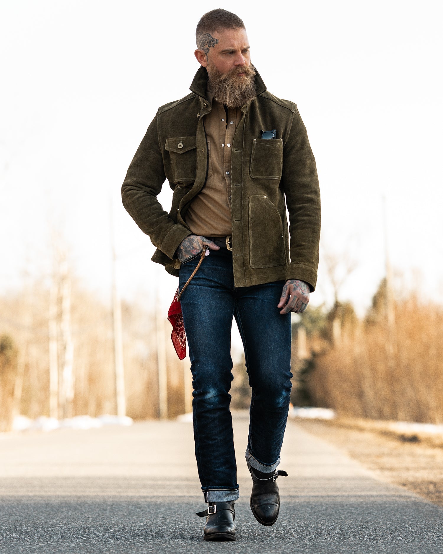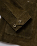 A rugged reinterpretation of the classic chore coat, built for durability, utility, and all-season wear. Cut from full-grain roughout cowhide in a deep tobacco-olive, this unlined Field Jacket is designed to break in beautifully and age with character.