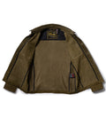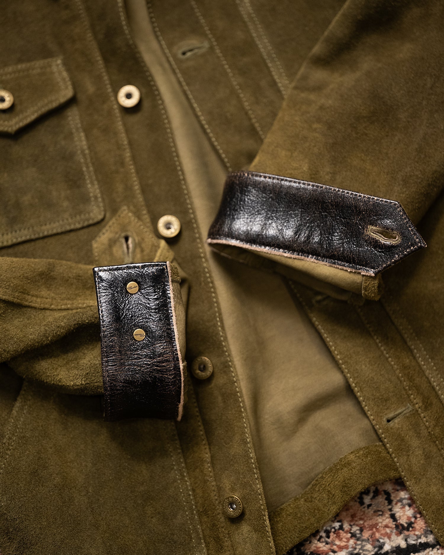 The interior is finished with 100% cotton twill seam binding for a clean, unlined construction. The collar and cuffs are backed with full-grain buffalo leather for added structure and strength.