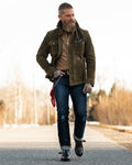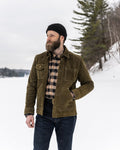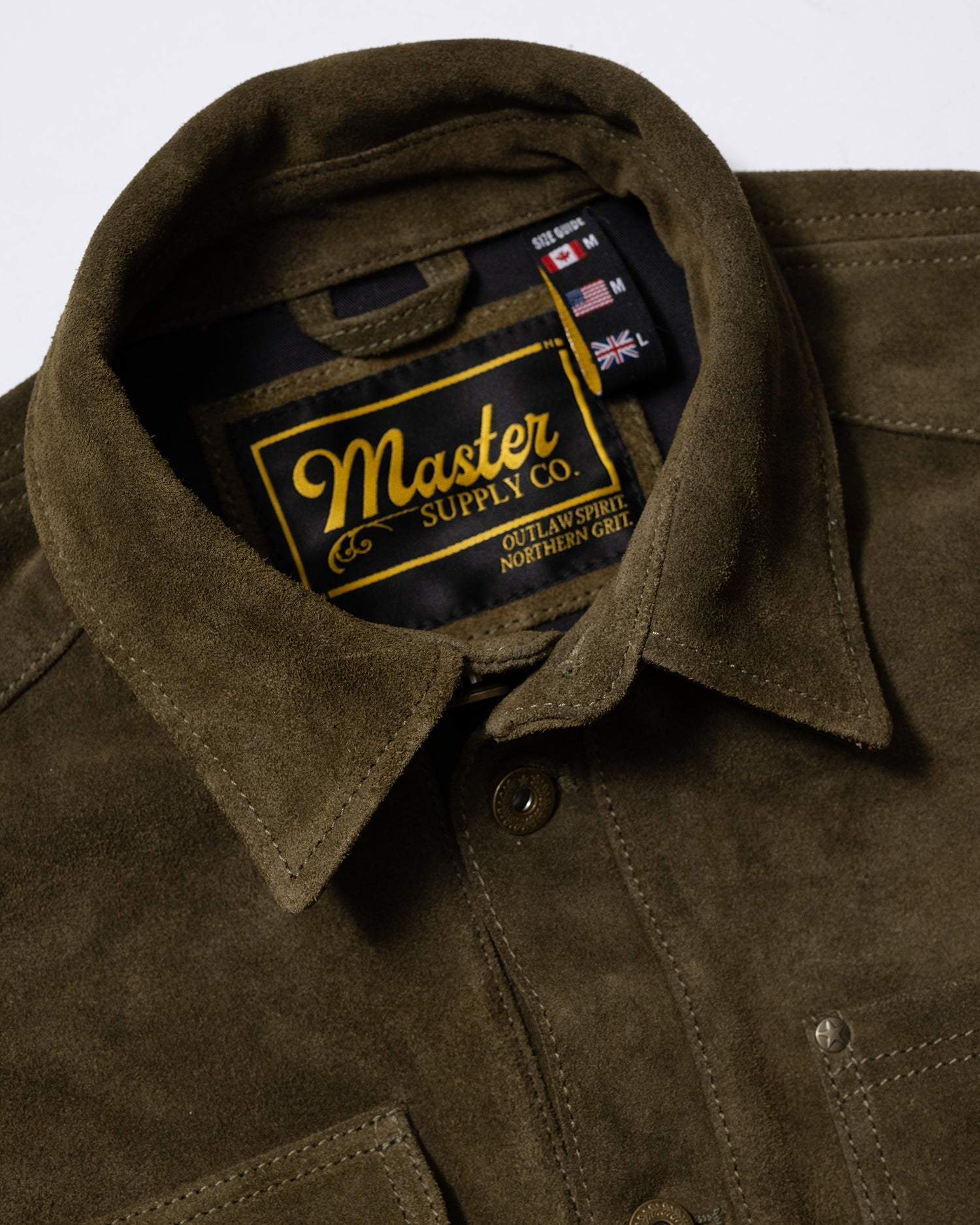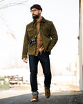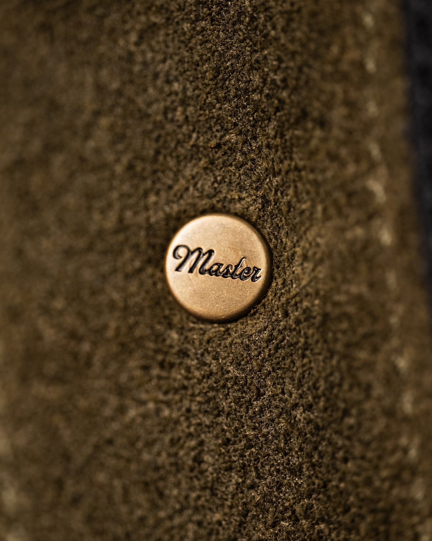 It features three reinforced patch pockets—two angled hand-warmer pockets and a left chest pocket—plus an additional buttoned flap pocket on the right chest. Each is strategically placed for accessibility and finished with rivets for extra durability. The jacket fastens with custom Master Supply Co. solid zinc donut buttons in antique finish, designed with a two-prong anchor for long-term reliability.