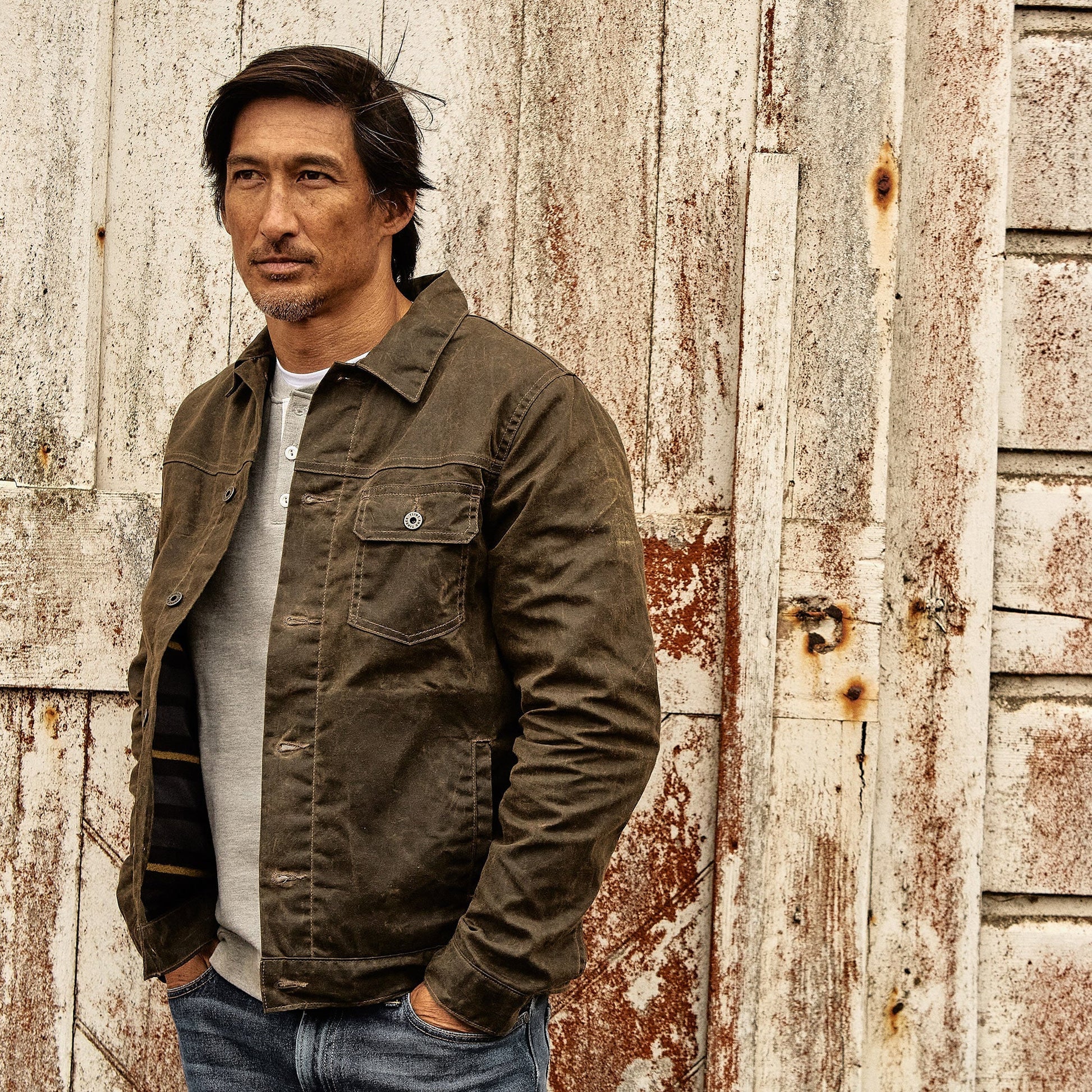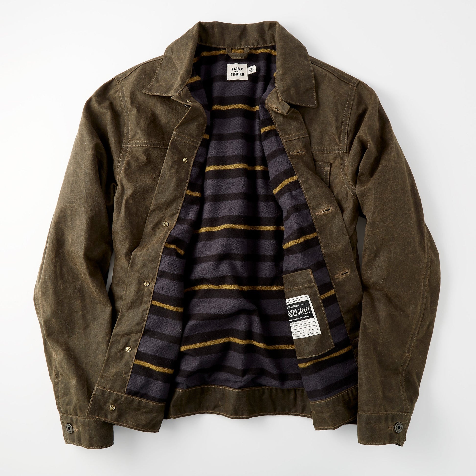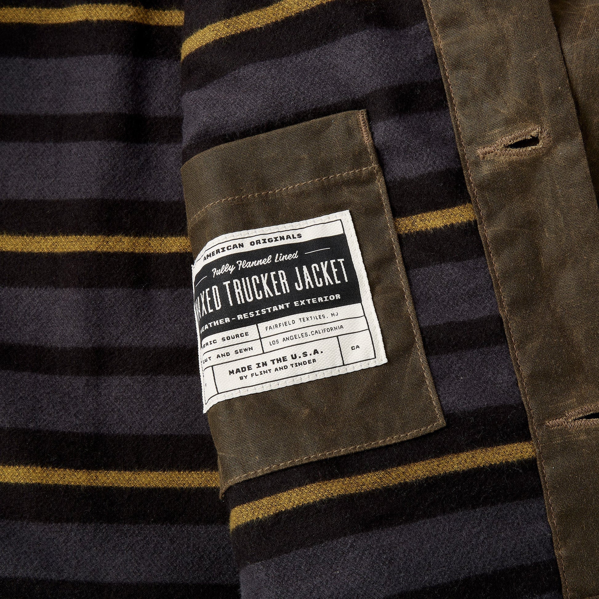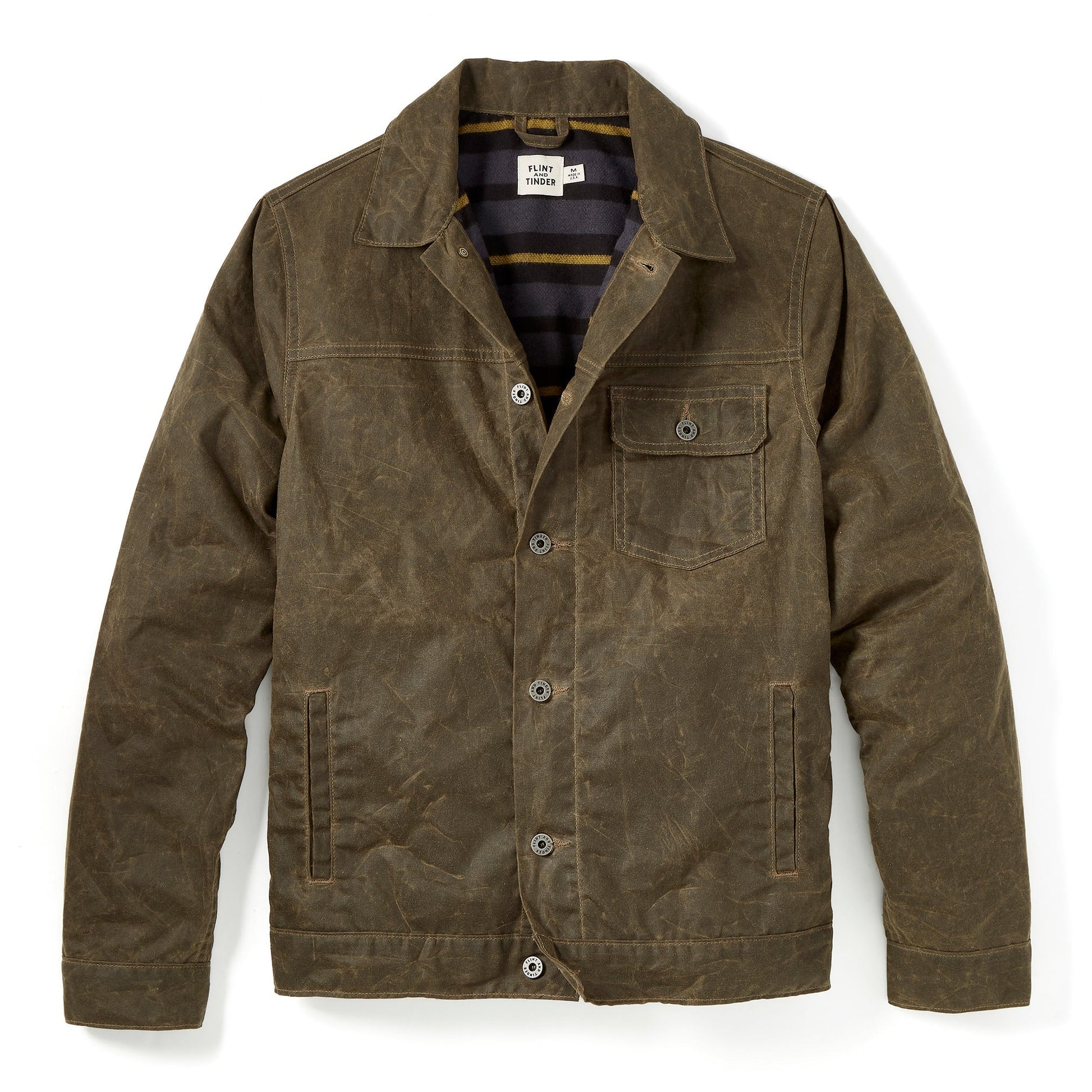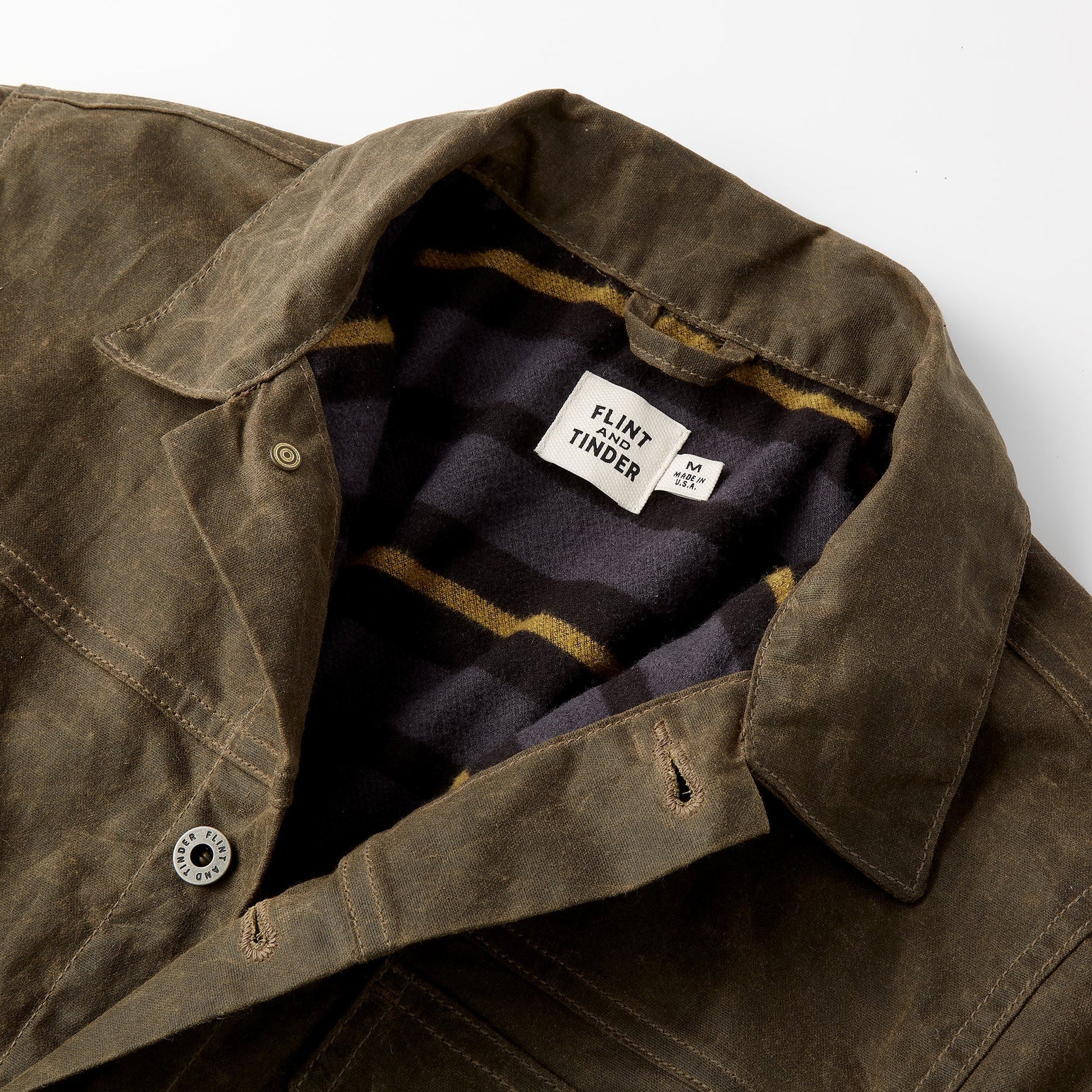 Flint and Tinder’s iconic waxed trucker jacket, flannel-lined for warmth and comfort