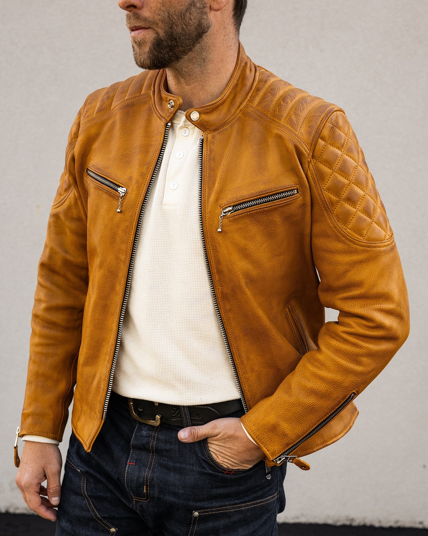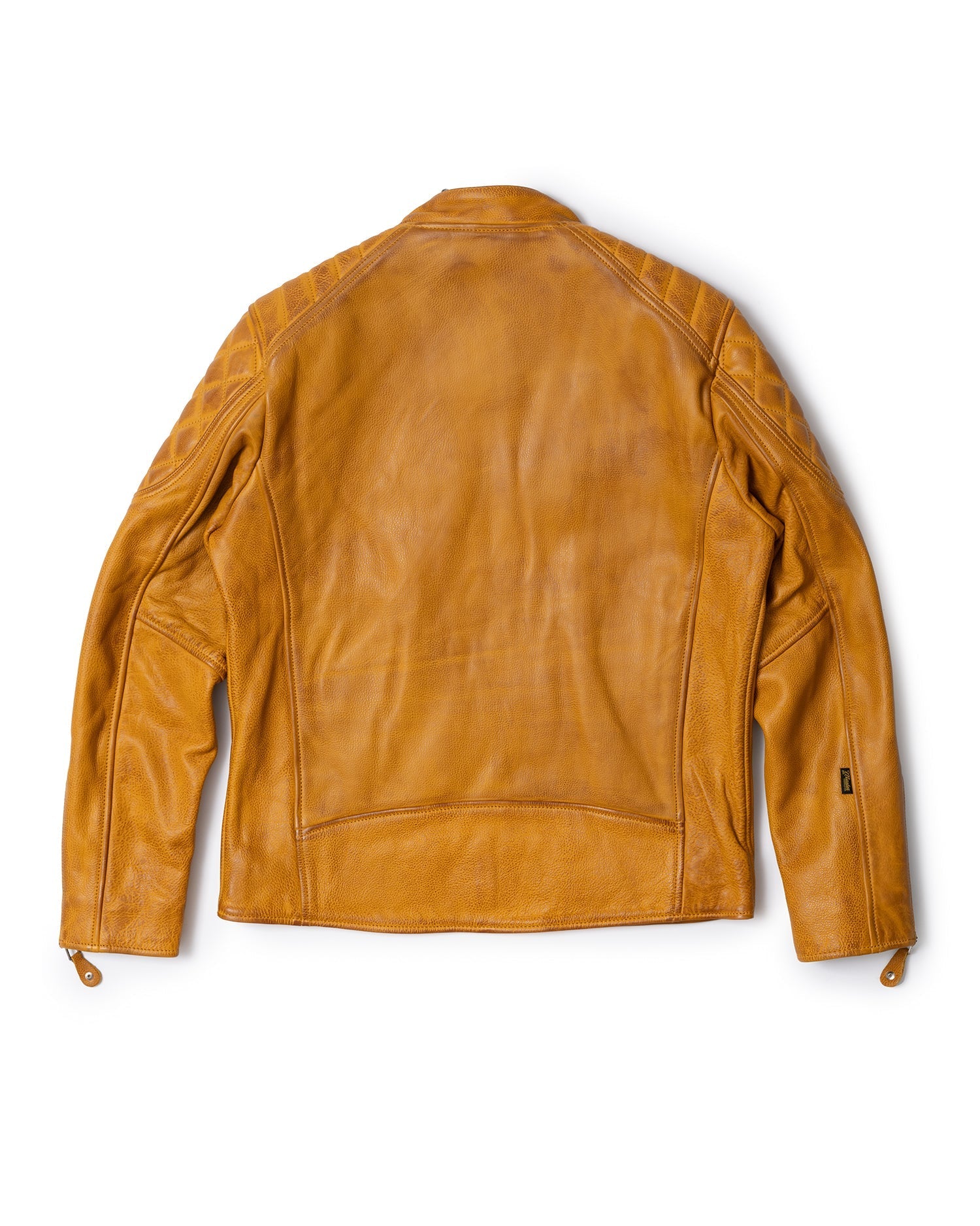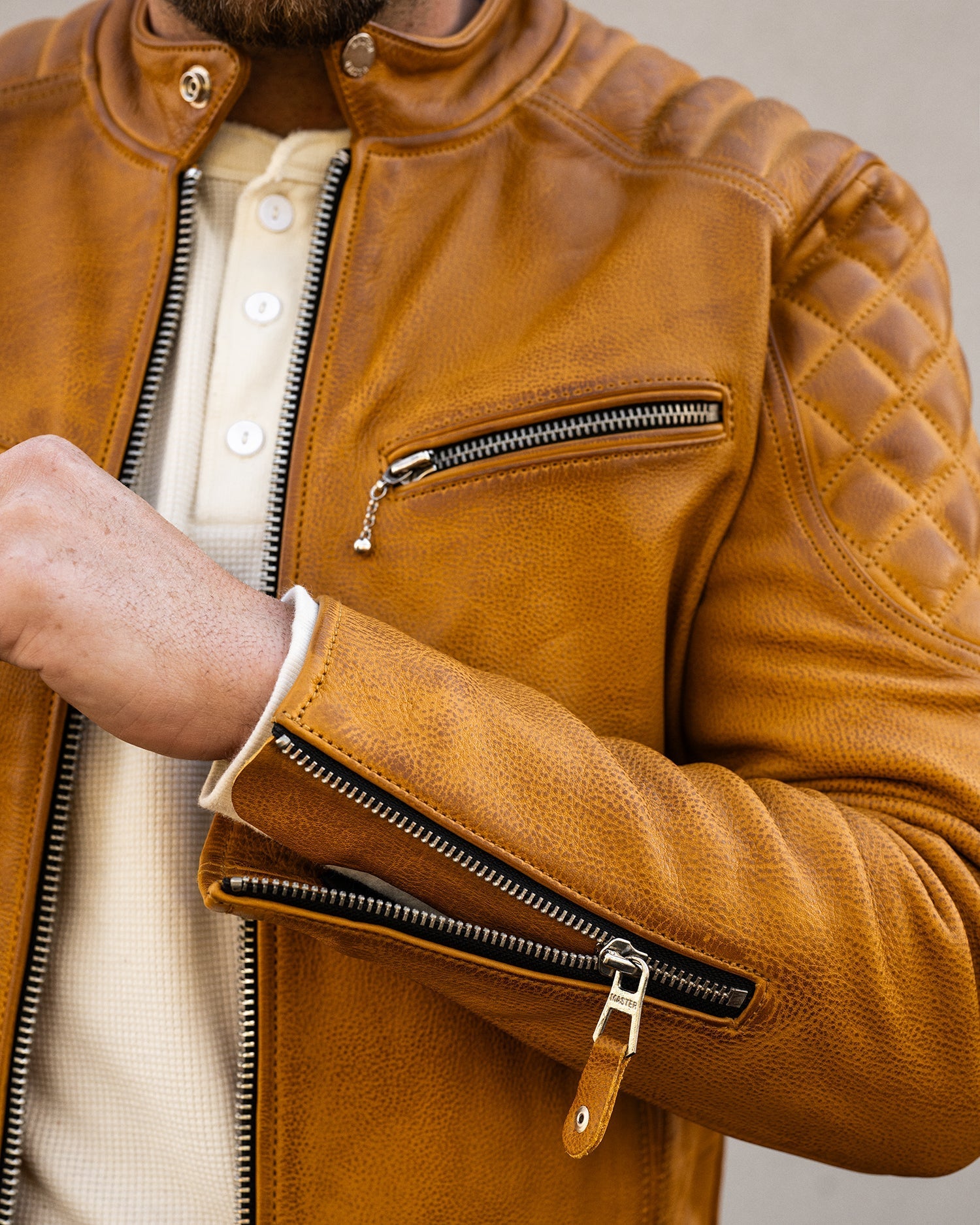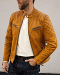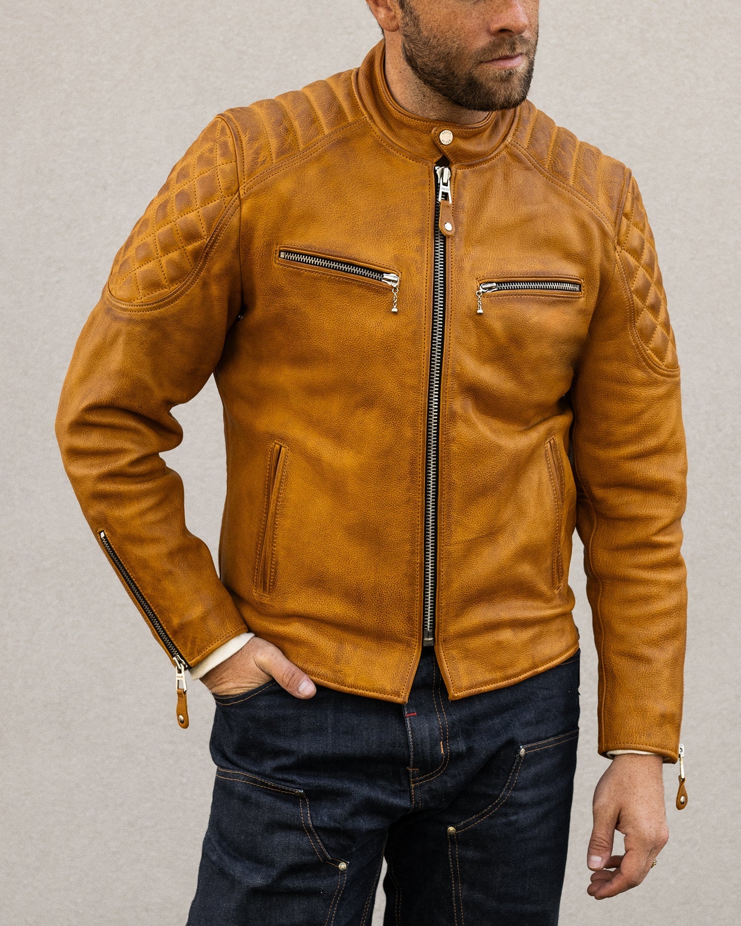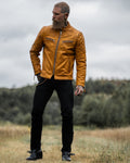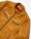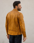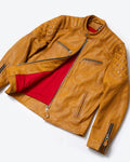 The Grand Prix jacket breathes new life into the classic racer style with a bold update to our design. Inspired by the thrill and resilience of race culture, this jacket is crafted from our premium gold semi-vegetable tanned cowhide leather, combining durability with character to ensure it stands out both on and off the road. The leather is oil-waxed, enhancing its appearance without distressing it. This process adds a slightly darker, weathered tone, giving the leather natural contrast and providing additional protection against the elements—ideal for those who desire an authentic look without a mechanically distressed finish.