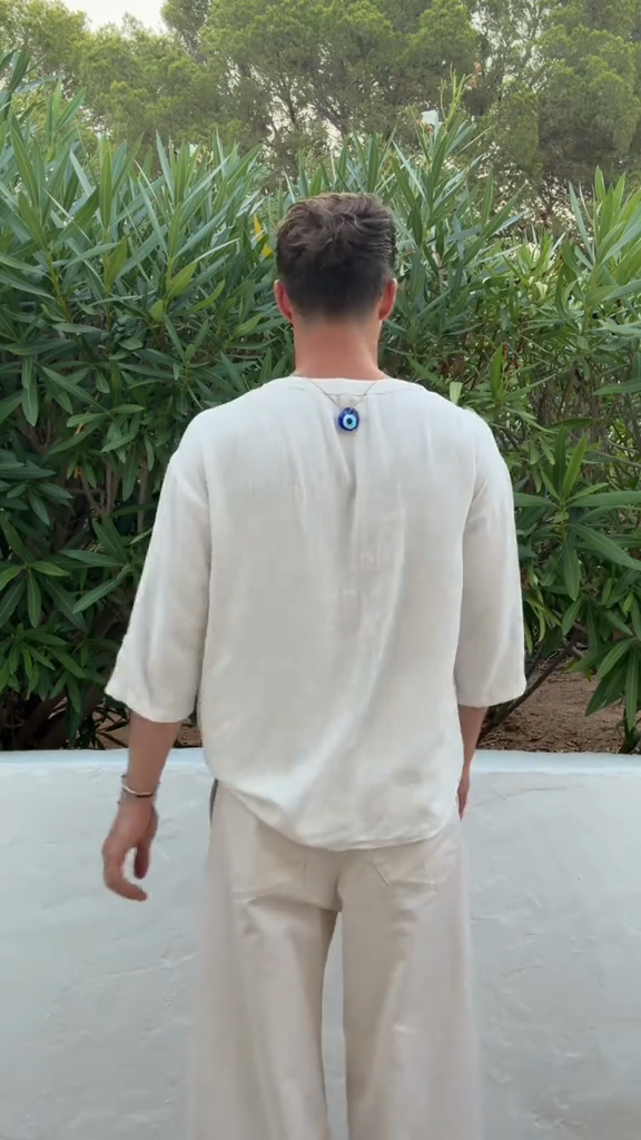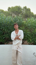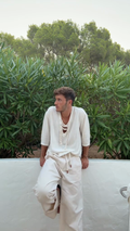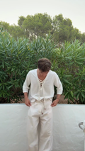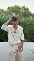 This set consists of a white, lace - up V - neck top with 3/4 sleeves and matching white, loose - fitting pants with a drawstring waist. The outfit has a relaxed, casual - chic vibe, perfect for warm weather or laid - back outdoor settings. The natural, breathable fabric suggests comfort, making it suitable for activities like beach outings, garden parties, or casual strolls.
