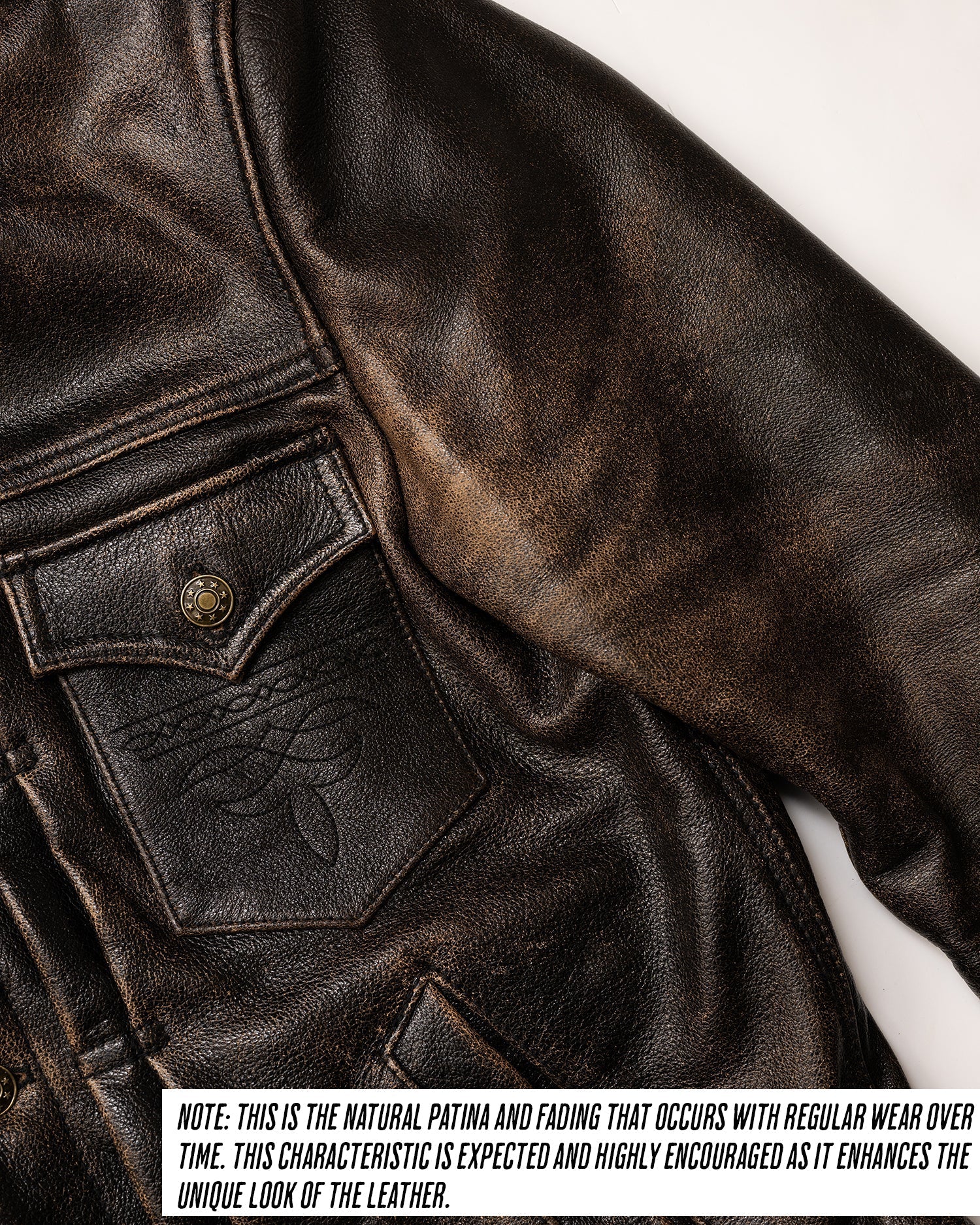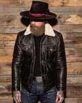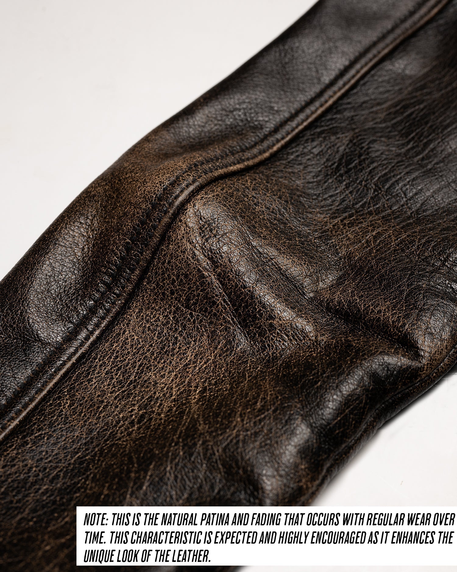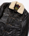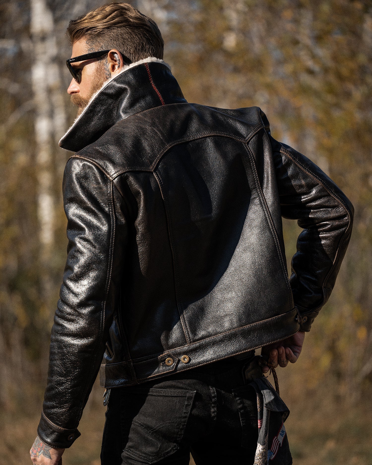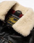 Please note: Each shearling collar, made from natural fur, may vary slightly in color or texture. The rapid patina development of the Accelerust leather is a deliberate feature, designed to evolve uniquely with wear. The leather’s core is dyed a deep cognac brown, with a pigmented black exterior that gradually wears to reveal the brown beneath, telling the story of your adventures. The Mark-IV is not just a jacket—it’s a personalized symbol of our shared journey, designed to evolve with every wear.
