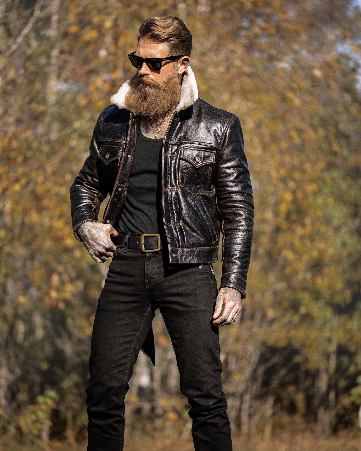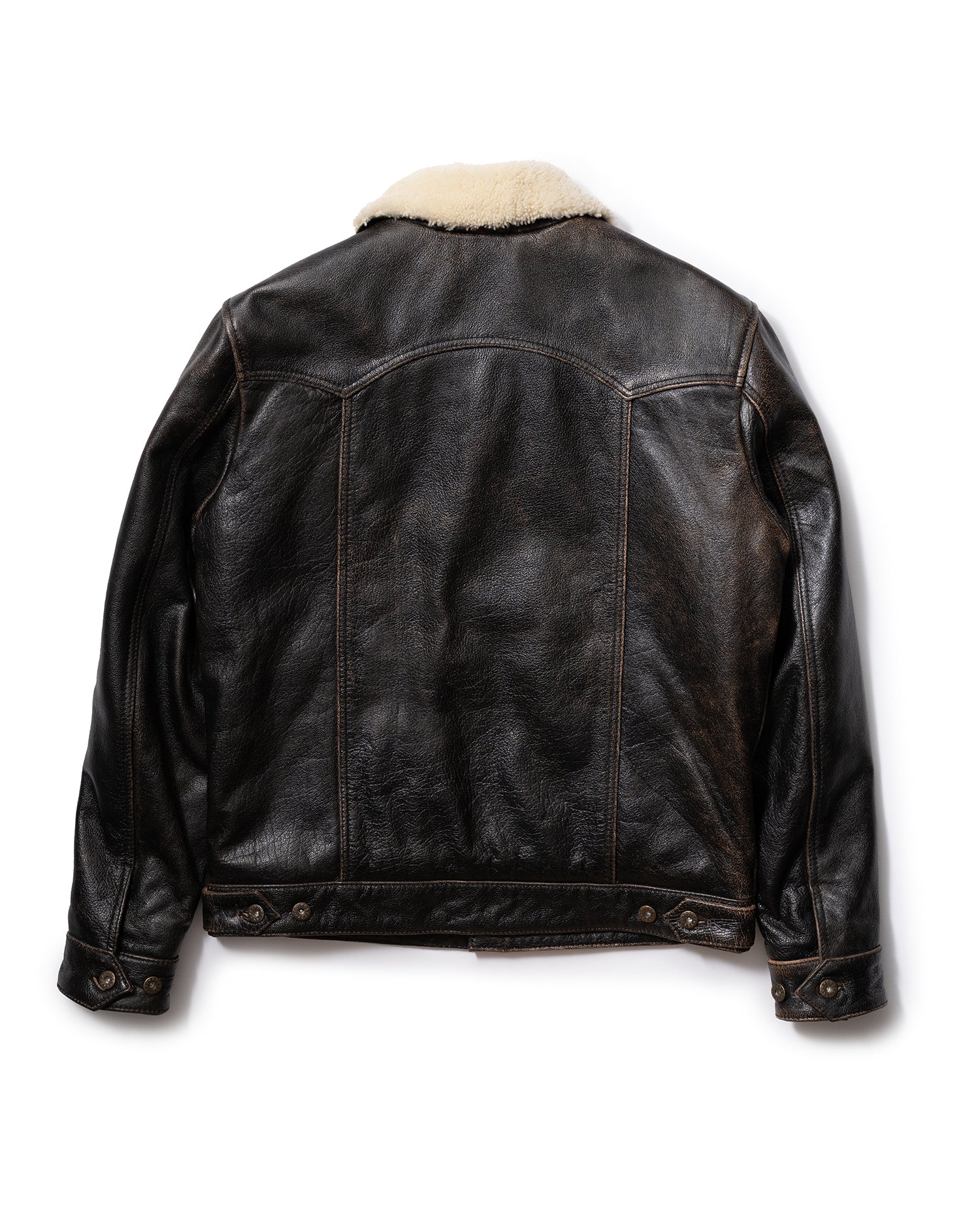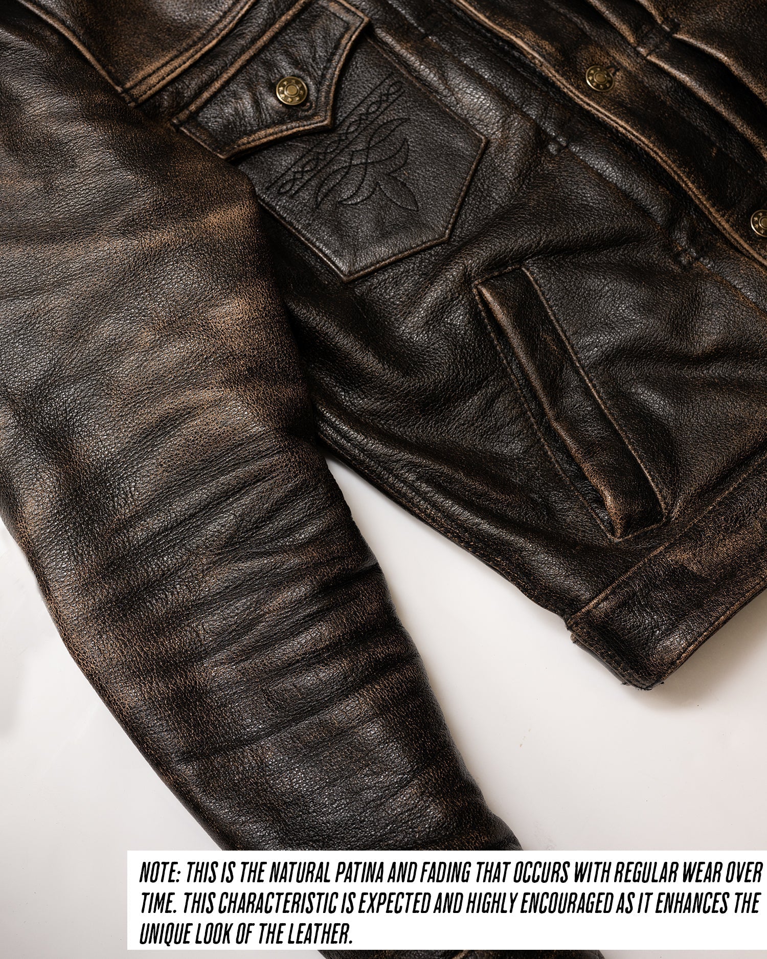 Please note: Each shearling collar, made from natural fur, may vary slightly in color or texture. The rapid patina development of the Accelerust leather is a deliberate feature, designed to evolve uniquely with wear. The leather’s core is dyed a deep cognac brown, with a pigmented black exterior that gradually wears to reveal the brown beneath, telling the story of your adventures. The Mark-IV is not just a jacket—it’s a personalized symbol of our shared journey, designed to evolve with every wear.