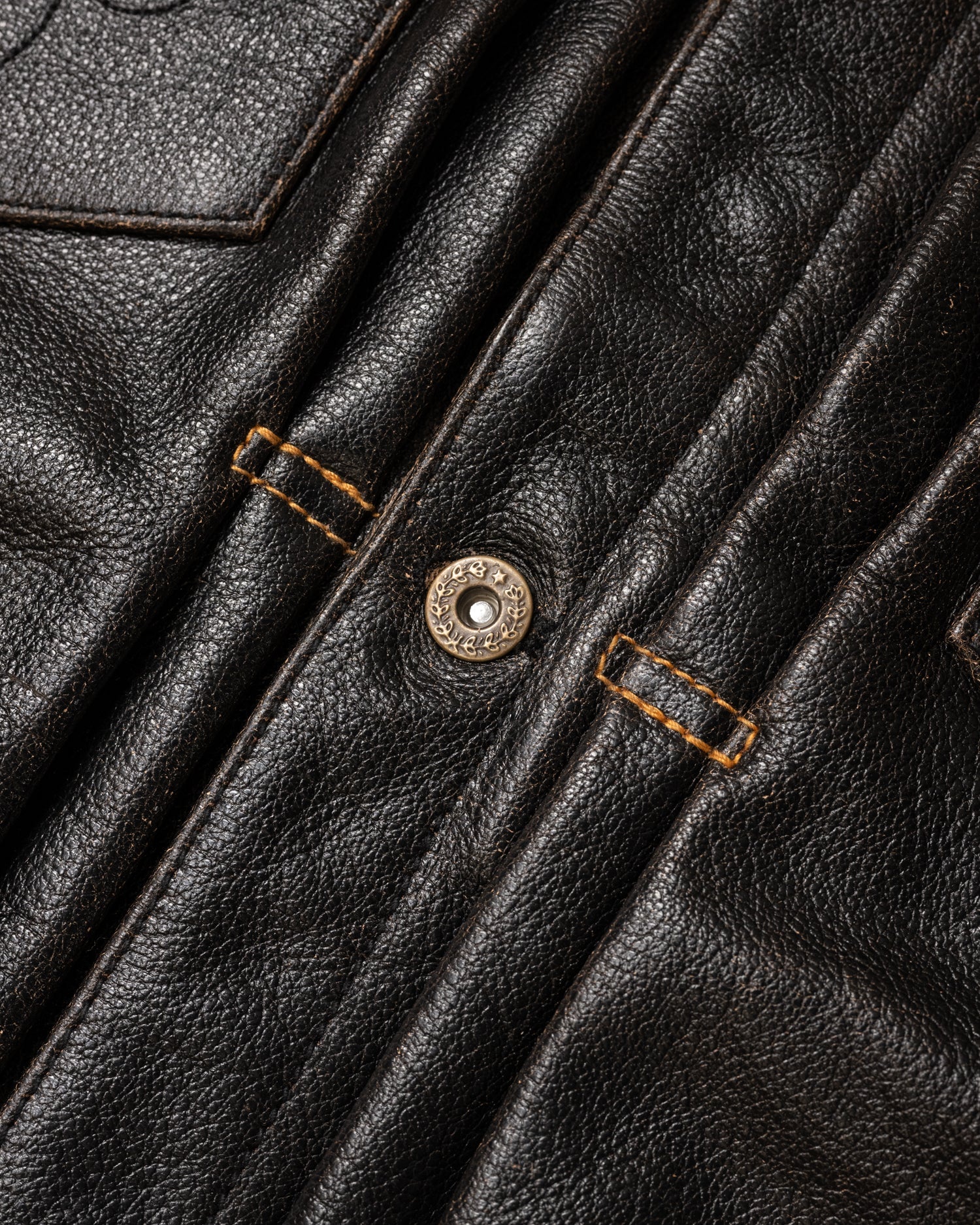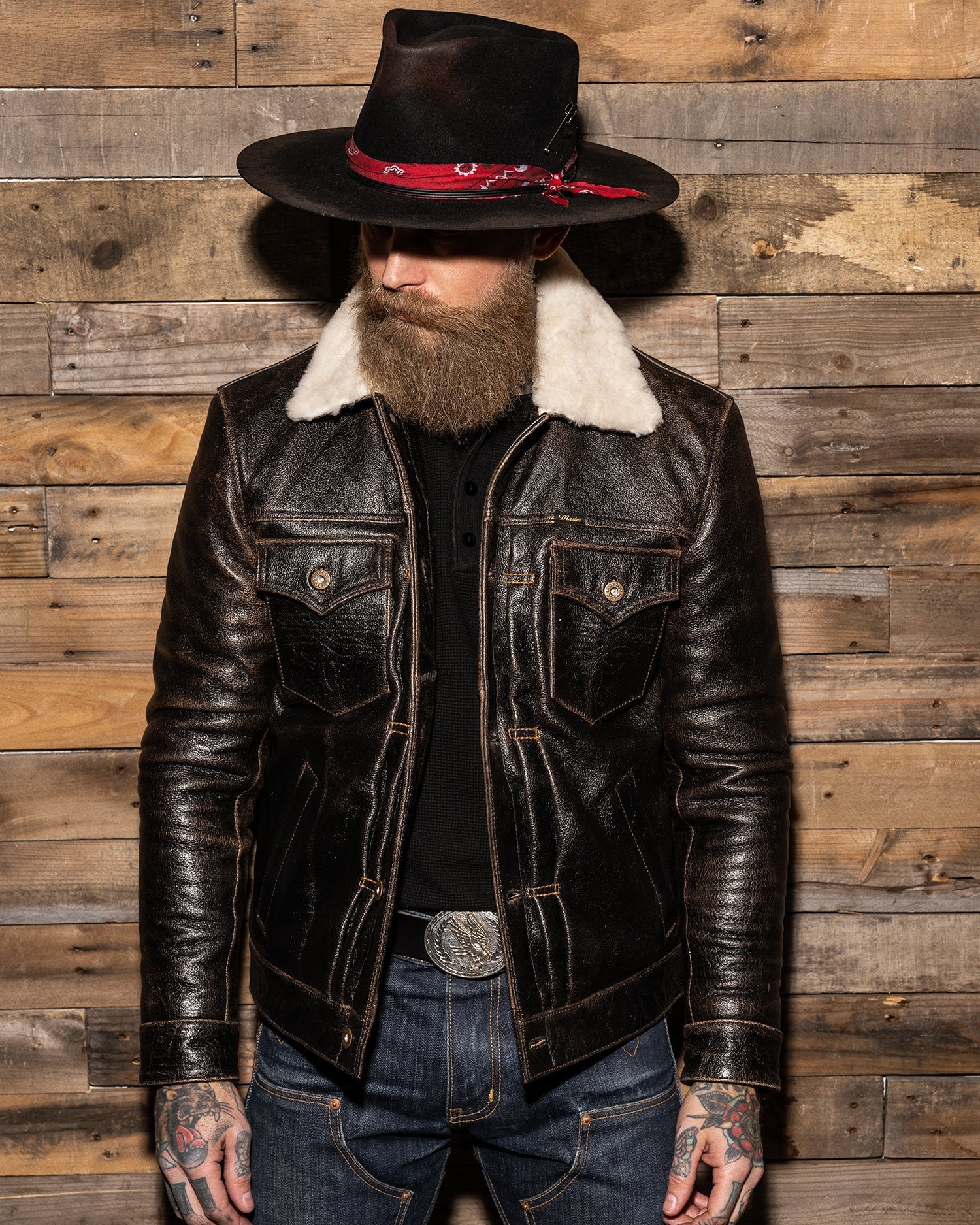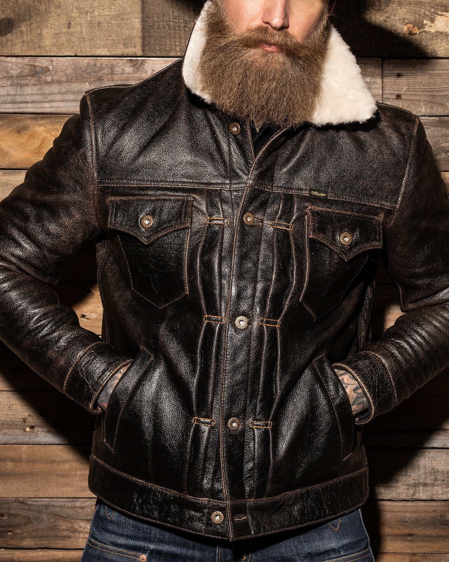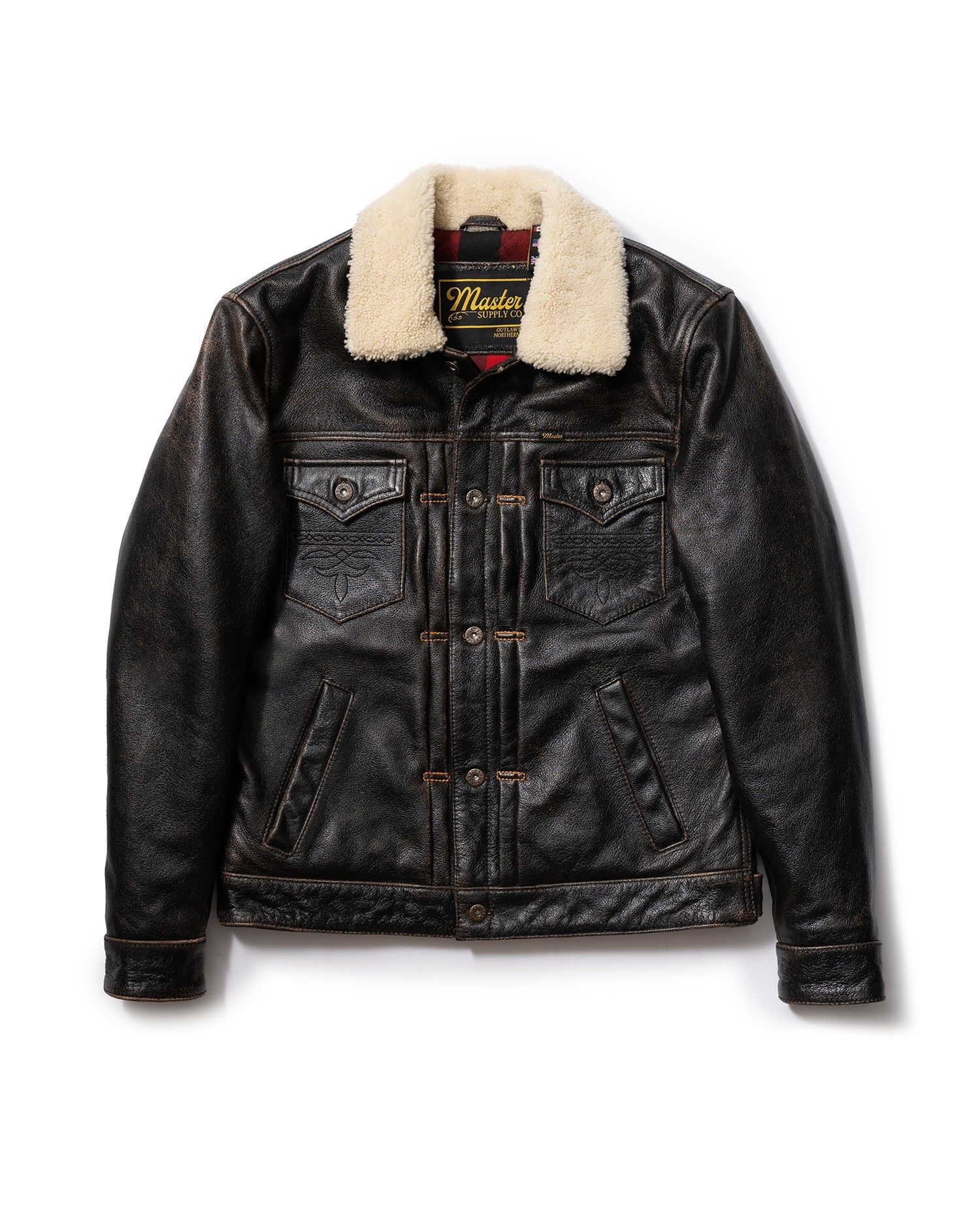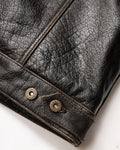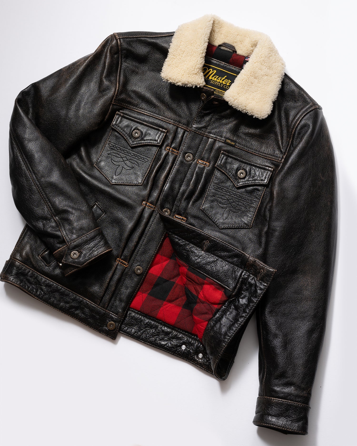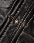The Master Supply Co. Mark-IV jacket is made from full-grain Accelerust buffalo leather, renowned for its unique patina potential that reveals a rich cognac brown core as it ages. Our signature pleated trucker silhouette, celebrated for its timeless appeal, is enhanced with symmetrical button placement, contrast pleat stitching, and familiar details like the western yolk and embroidered chest pockets.