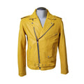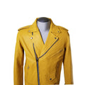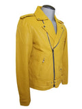 Get the luxurious yet simple olsons yellow biker style leather jacket with waist belt that can upgrade your look so well while protecting you from the harsh winter breeze. This jacket will give you exceptional look without any effort. It is lined with statin polyster that provide you with a comfortable and warm fit, zipper closure for easy to wear, collar and notch lapels, open zipped cuffs, a coin pocket , one inside pocket, and three outside zipper pockets to make your hands warm.