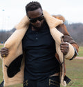 This Rocco Vintage Shearling Jacket will be your go-to piece of outwear this season. Made from double-faced sheepskin shearling for a cushiony exterior and a thick pile sheepskin shearling interior. Our reliable Rocco vintage has a fur-lined collar and a detachable shearling hood for extra insulation. This stylish, limited-edition color jacket has an adjustable belt with a buckle at the waist and fur-lined, open cuffs to keep you warm.