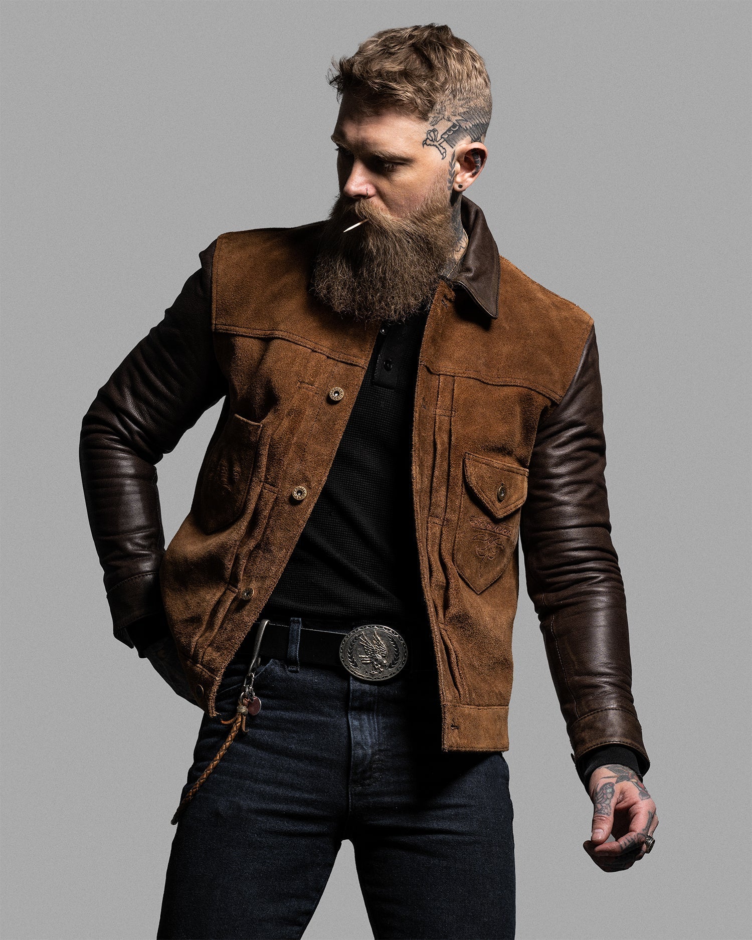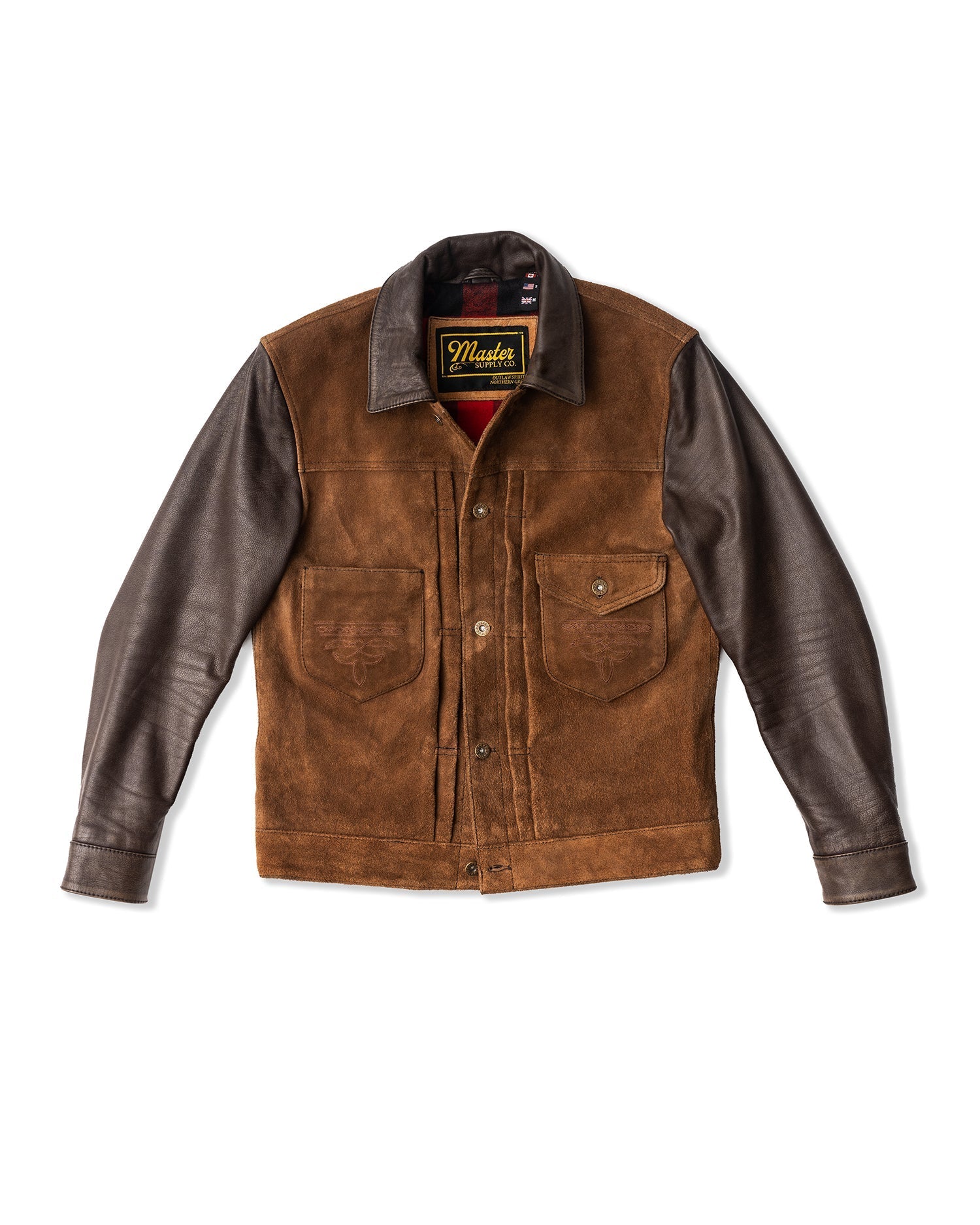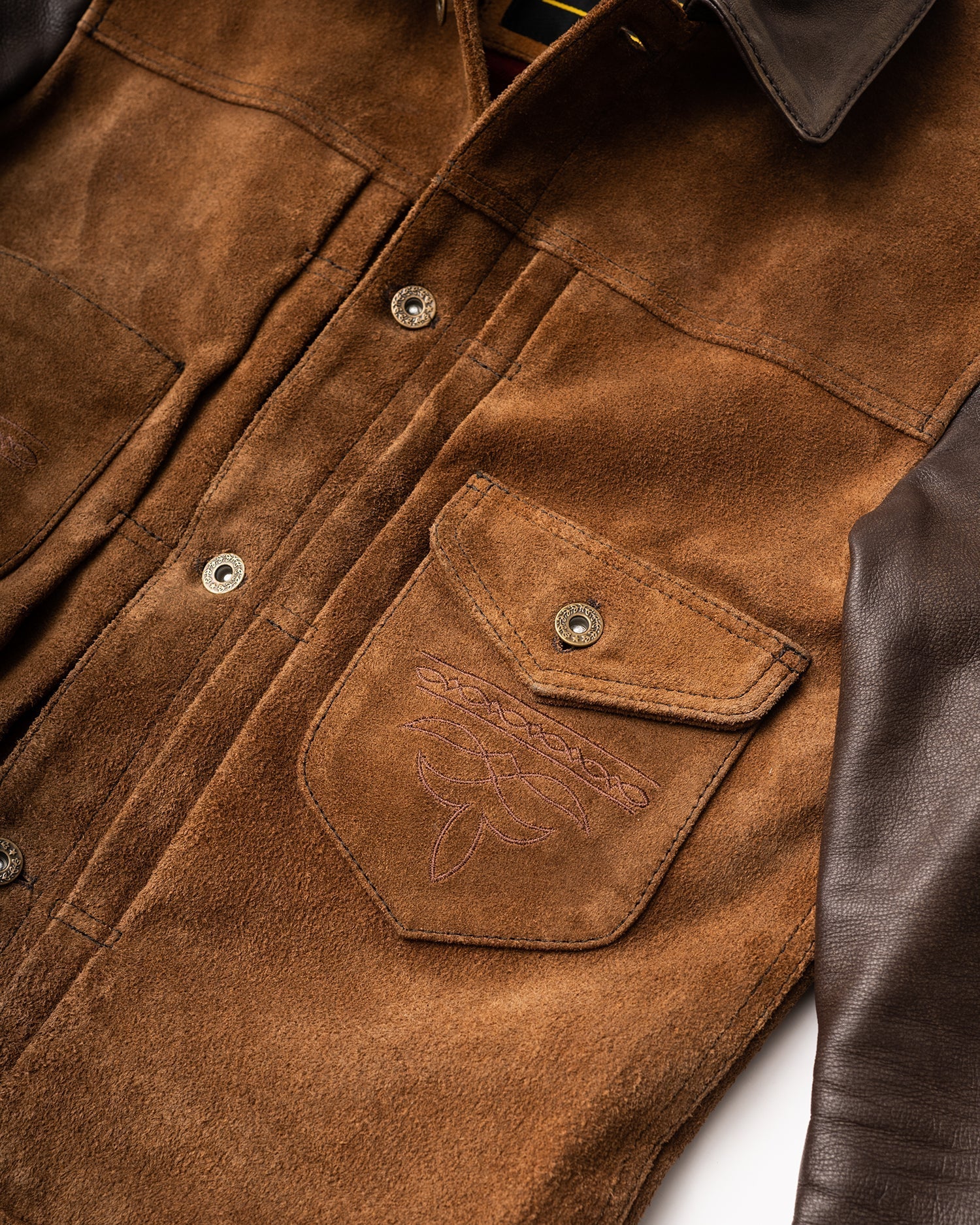 The standout mid-body pocket configuration is framed by vertical pleating, giving the jacket an assertive, utilitarian presence. Western design cues are carried through with our signature pocket medallions and contrast detailing.
