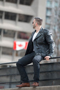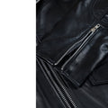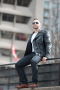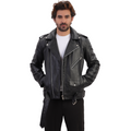 Grab this stylish slim-fit biker-style jacket with a belt. In addition to providing a perfect fit, it is also warm enough to be worn anywhere. A zipper closure and adjustable belt with buckle are used to close this leather jacket. The jacket is lined with satin polyester for warmth and comfort, has notch lapels adorned with pressed studs, has studs on the cuffs, has one pocket inside, three functional pockets outside, and a coin pocket.