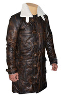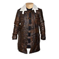 Seeking a gothic vibe trench coat than our The Dark Knight Rises Bane's Distressed Leather Trench Coat will be a perfect option for you. This mind-blowing coat has a Buttoned Closure, Shirt style collar with Faux Shearling, open Hem cuffs with a belt, 1 pocket inside, and 2 zippers & 2 flap pockets outside. Last but not least, a distressed textured design will add a unique charm to your personality.
