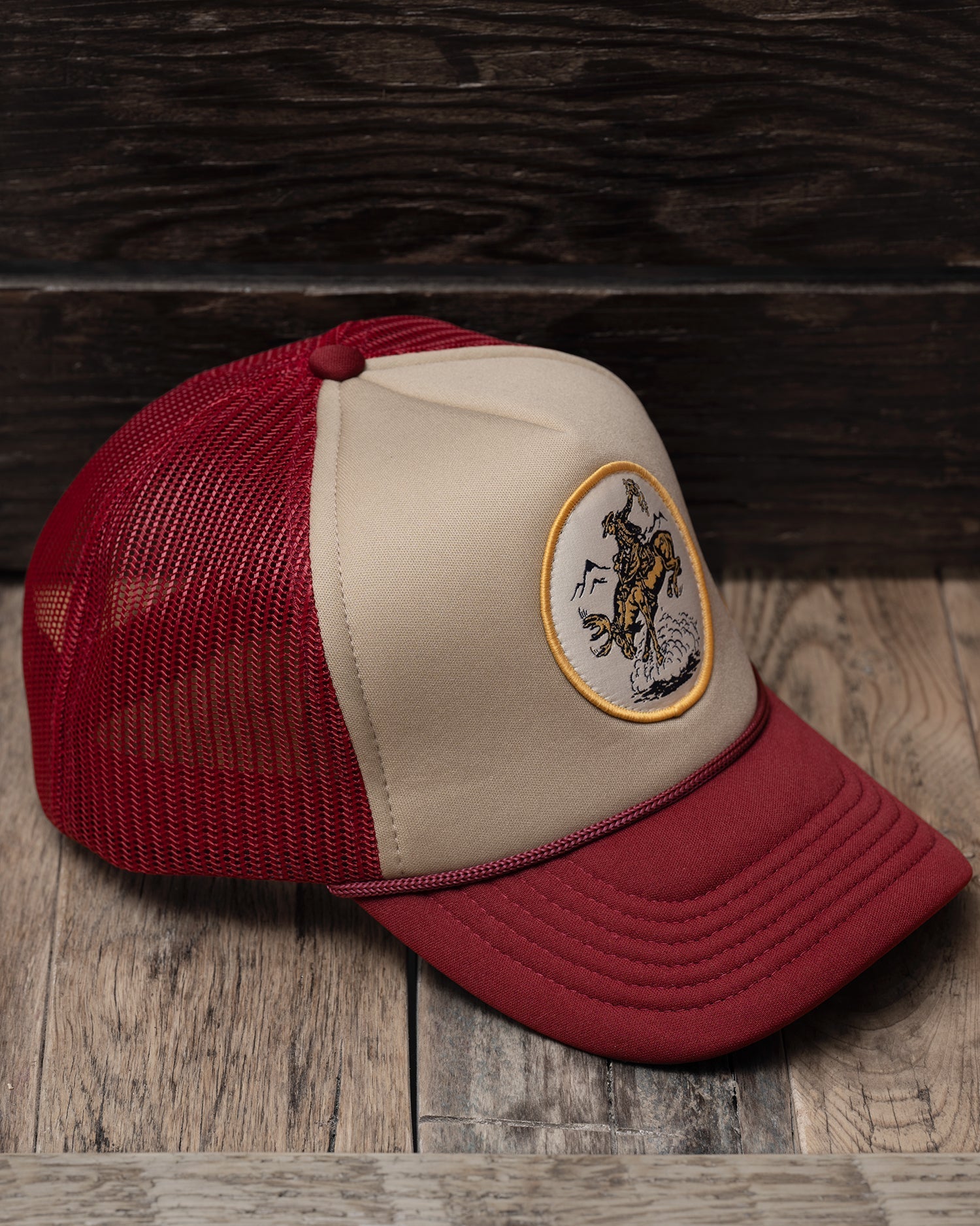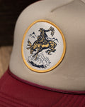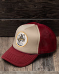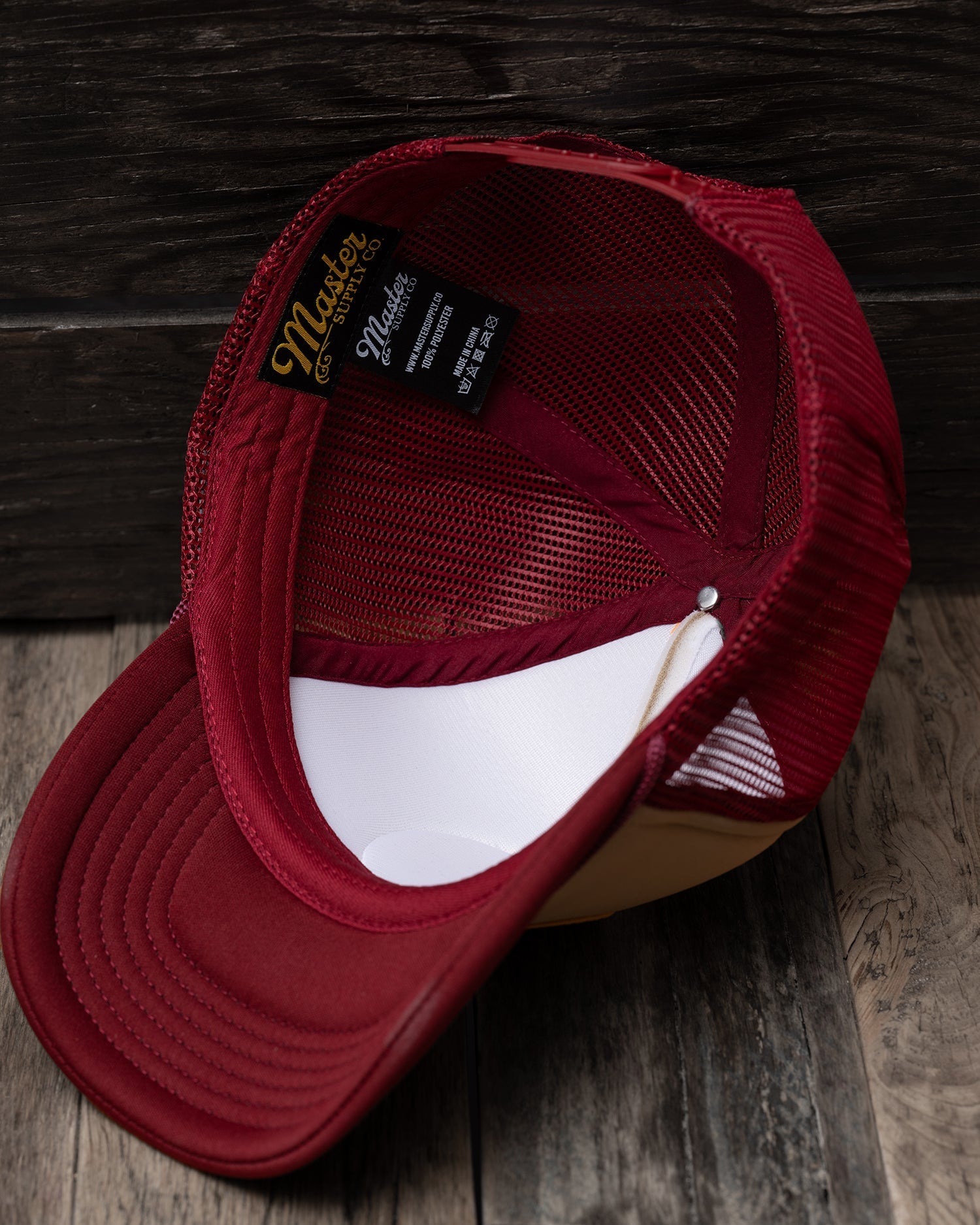 Our premiere trucker cap blends vintage look and feel, with our usual standard of quality! The burgundy mixed with the subtle off-white front is both classic and poppy. Not to mention the use of foam throughout this hat, you'll definitely feel the difference it makes. Most of all, we love to use our ultra signature "Holy Buck, Boys!" patch. Everything about this trucker cap just feels perfect for us!