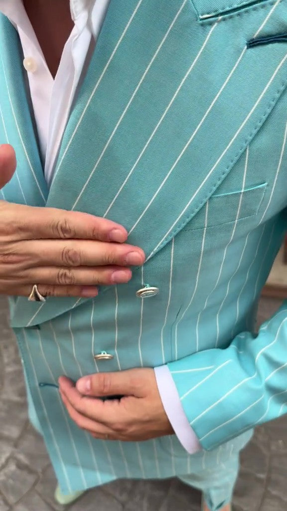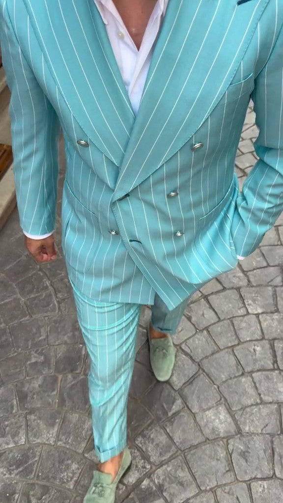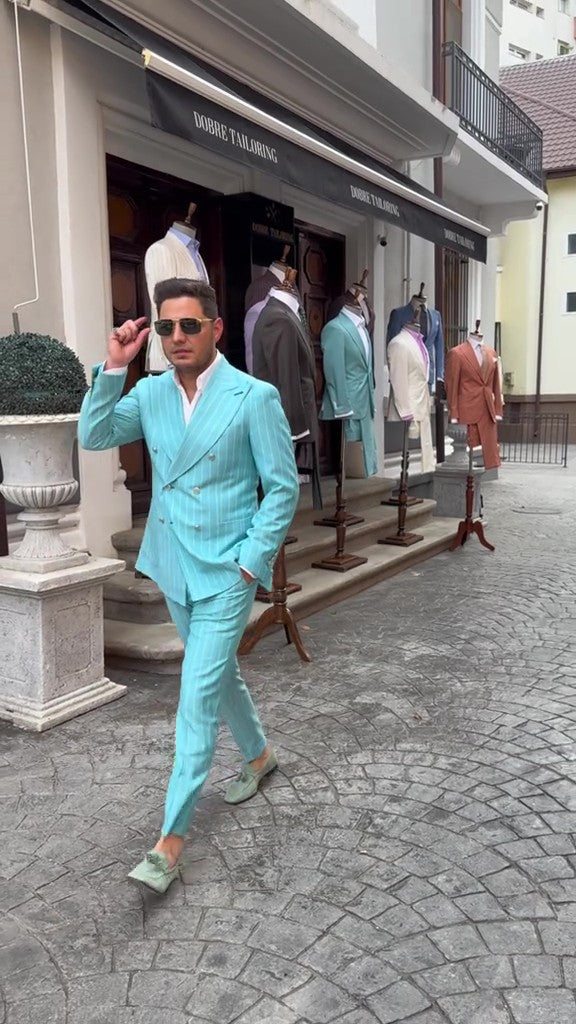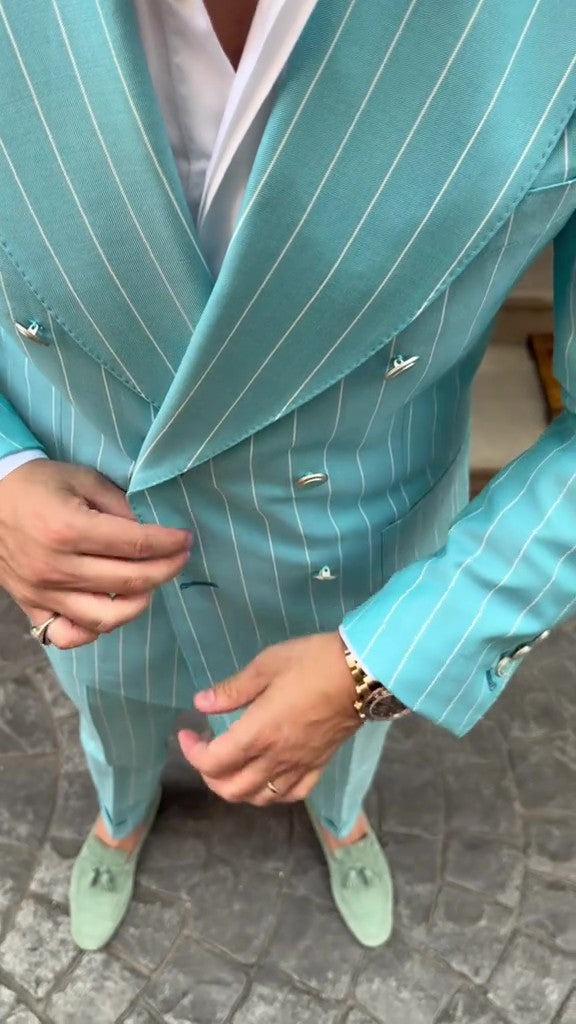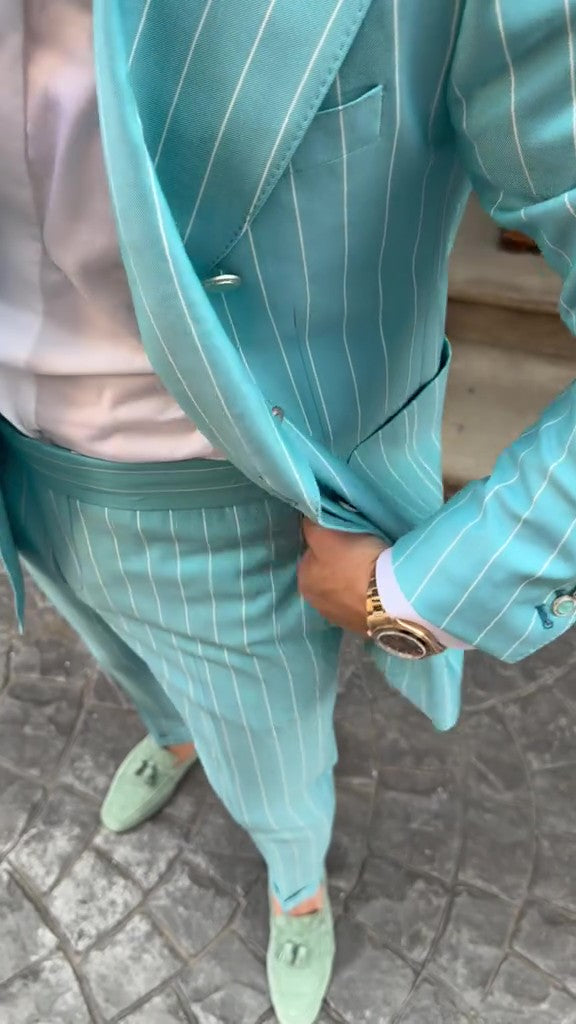 Whether you're a fashion - forward professional, a groom looking for a unique wedding suit, or someone who simply loves to dress to impress, this turquoise pinstripe double - breasted suit is sure to become a favorite in your wardrobe. Make heads turn and leave a lasting impression with this one - of - a - kind ensemble.