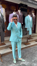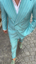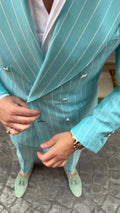 Step into a league of your own with this show - stopping turquoise pinstripe double - breasted suit. Crafted for the modern man who isn't afraid to make a statement, this suit seamlessly blends classic tailoring with a bold color choice.